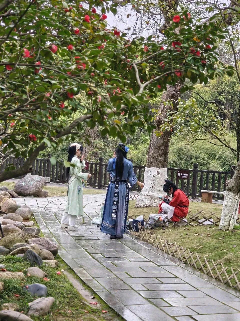 走出文创商店,还未到闭馆时间,于是我们决定四下逛逛。林荫小道上,烂漫花丛下,时常见到身着汉服的年青女子,或撑着油纸伞悠然漫步,或几人在一起排练古装剧目,姑娘们为这一幅春意盎然的画卷添上了几分动人色彩。