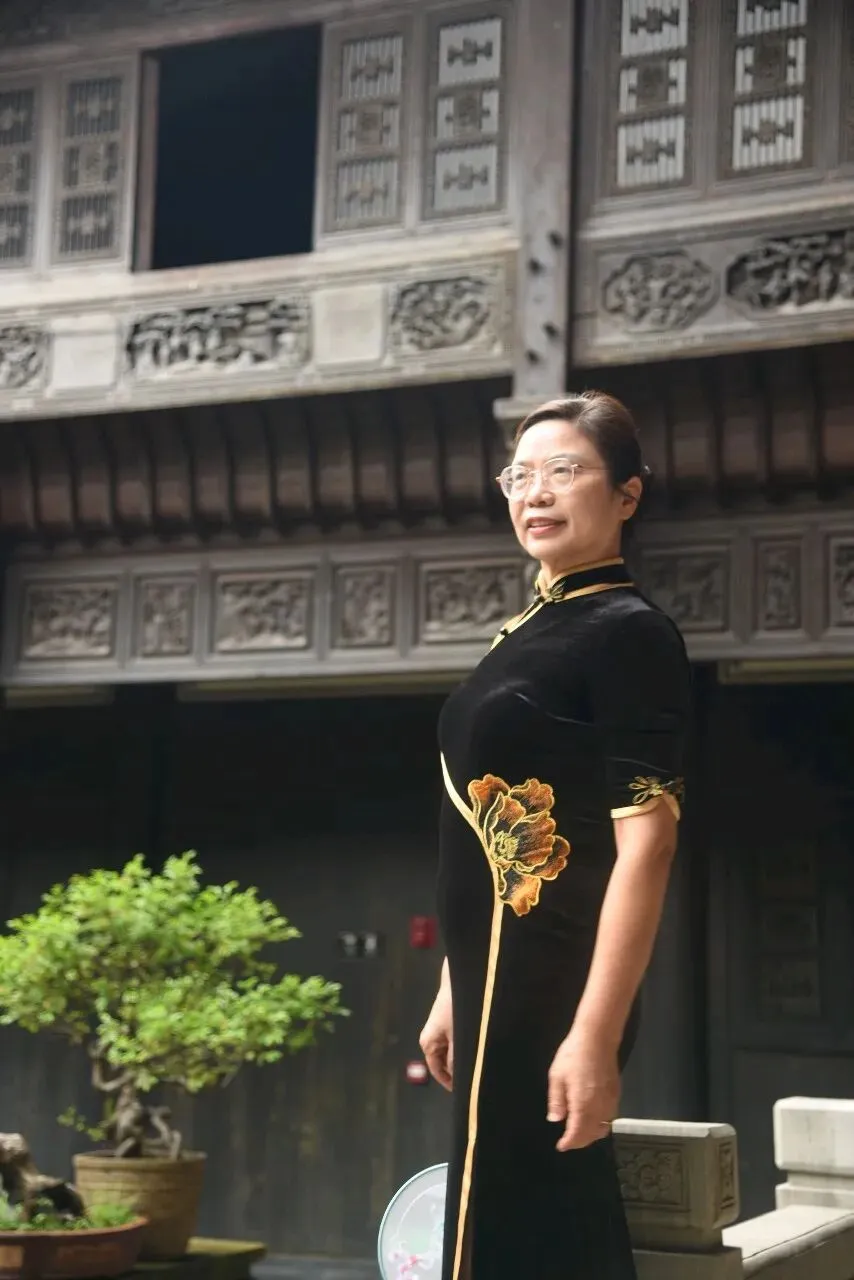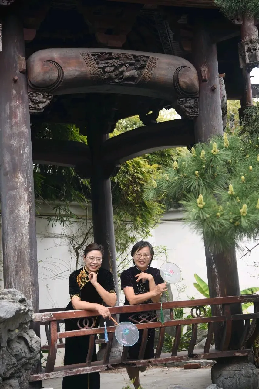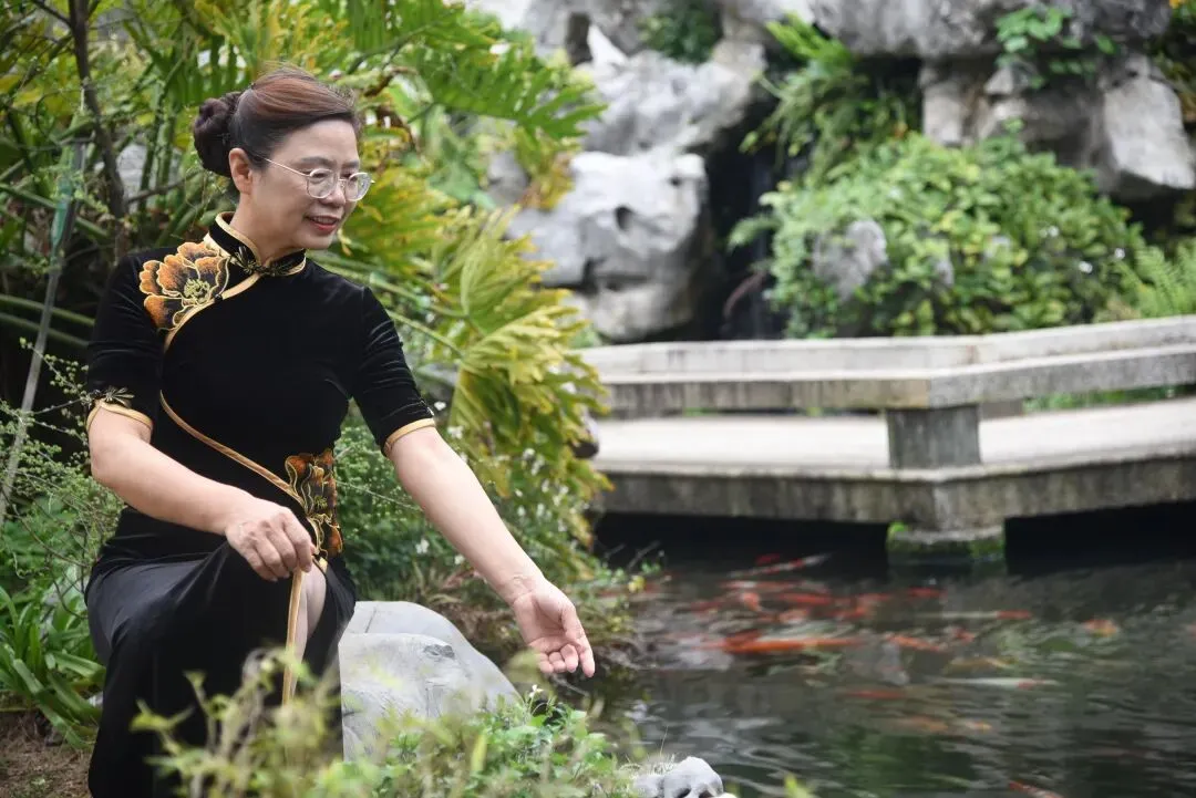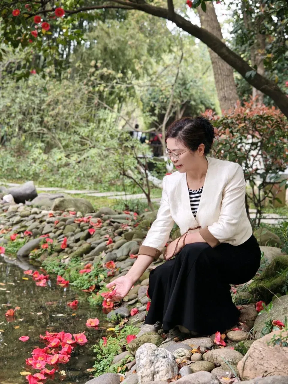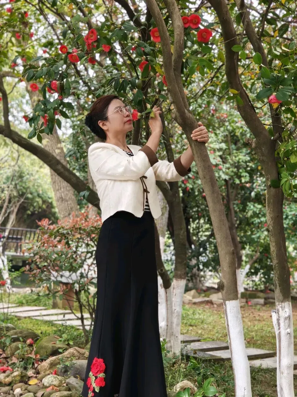 爱美岂只是年青人的专利,瞧,咱们的英子立于一株茶花树下,上着白衣,下配黑裙,裙摆处的数朵红牡丹恰好与树上娇艳的茶花相映成趣。她时儿轻嗅花香,时而俯身拾起飘落于池边的花瓣,尽显优雅知性之美。