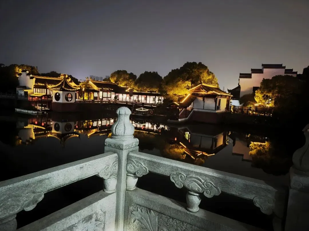 晚饭过后,我们四人结伴沿湖岸散步,对岸的亭台楼榭皆亮起各色霓灯,倩影倒映于水波中,令夜幕下的梅湖凭添几分梦幻之美。