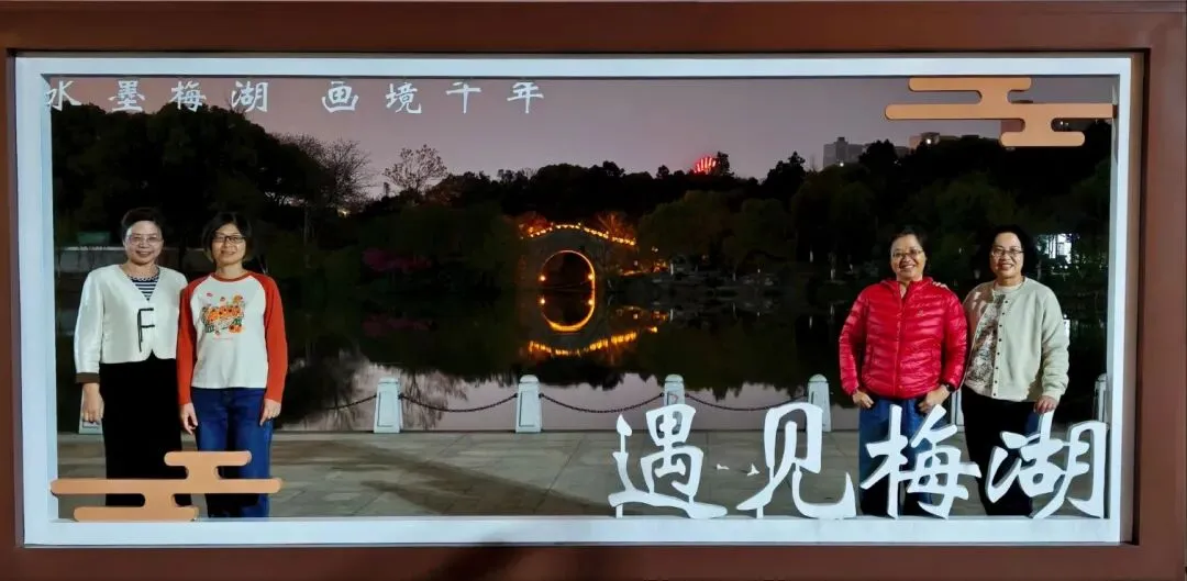 这一个画框已经放置有一段时间了,白天望画框里一瞧,湛蓝的天空与岸上的花木倒映于碧波之上,与此刻夜幕下的梦幻倩影一样秀丽动人。美则美矣,但总觉得缺少点什么,直到英子提议我们在画框前合影我才恍然大悟,画框里留下了我们的身影与欢笑,这才真正叫“遇见梅湖”,相约画中行,人从画中来!