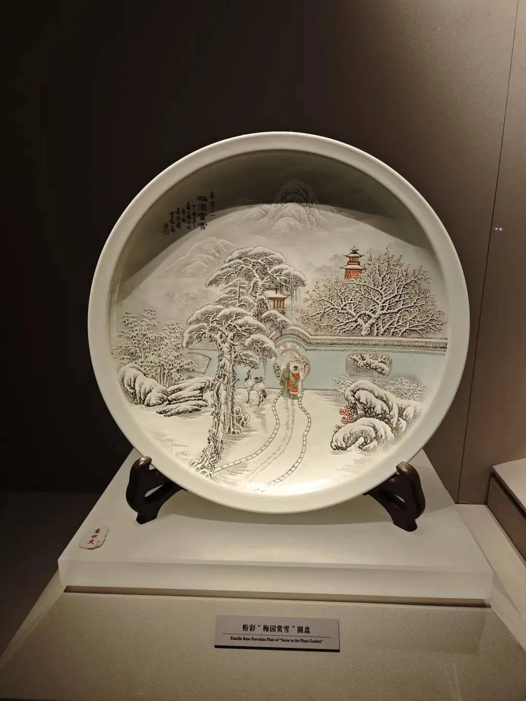 江西景德镇为享誉海内外的著名瓷都,省博物馆除了展出大量珍贵的瓷器出土文物之外,正在举办的“盛世瓷韵--当代景德镇陶瓷艺术名家捐赠作品展”也吸引了不少游客。我们来到景德镇“珠山八友”第三代传人袁世文老师创作的粉彩“梅园赏雪”圆盘前:粉妆银砌的琉璃世界里,一对伉俪踏着积雪,相携着走向梅园。女子身披红斗篷,与园中的点点红梅相映成趣。一对丹顶鹤立于雪中,正悠闲地剔羽,仿佛是他俩忠贞浪漫的爱情化身。那对伉俪的背影似乎有点熟悉,“年年雪里,常插梅花醉”,想起李清照的《清平乐》,词中深情回忆早年与丈夫赵明诚踏雪赏梅之雅事,正如眼前水彩园盘所描绘的情景。