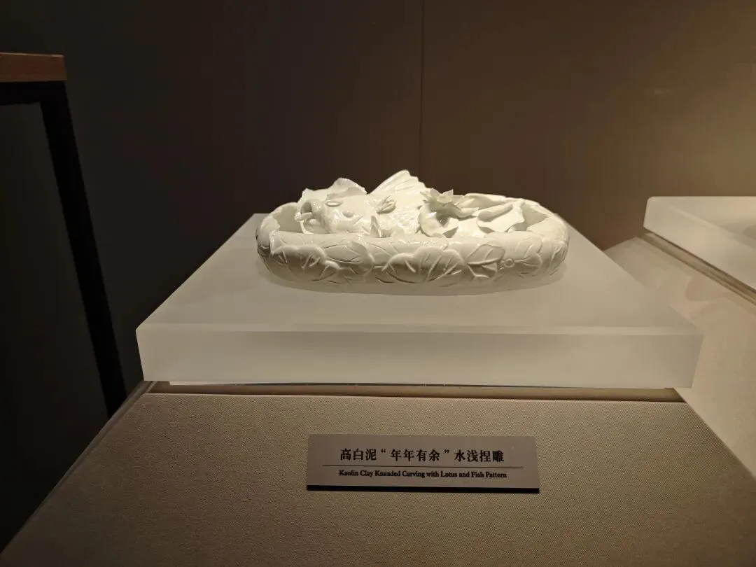 景德镇雕塑瓷手工制作技艺代表性传承人张正海老师的作品高白泥“年年有余”水浅捏雕则活灵活现,荷花盘中一条大鱼张开大嘴,仿佛下一秒就要一跃而出!