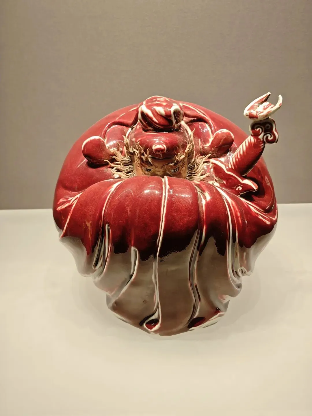 景德镇美术家协会副主席曾亚林老师的郎窑红“钟馗”雕塑色彩鲜艳,造型奇特,钟馗躬身而立,宽大的衣袖遮住了他大半张脸,一双豹眼却目光如炬。