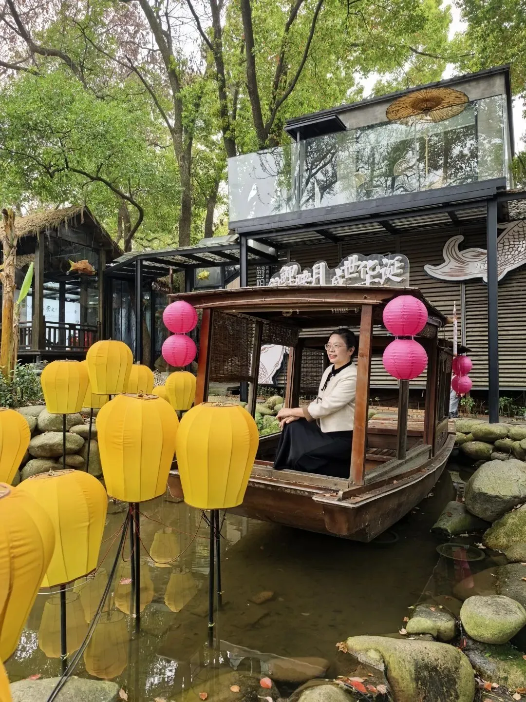 从省博物馆出来已是下午十二点多,阿锋在网上寻到一处评分较高的餐馆,位于下罗的“鲟阳渔村”。当我们打车赶到那儿时,正赶上举办“踏春鱼鲜节”,热闹非常。一路行来,画舫上红灯挂起,清池里锦鱼嬉戏,穿小桥,踏石板,坐闲亭,颇有几分江南渔村的闲适风韵。