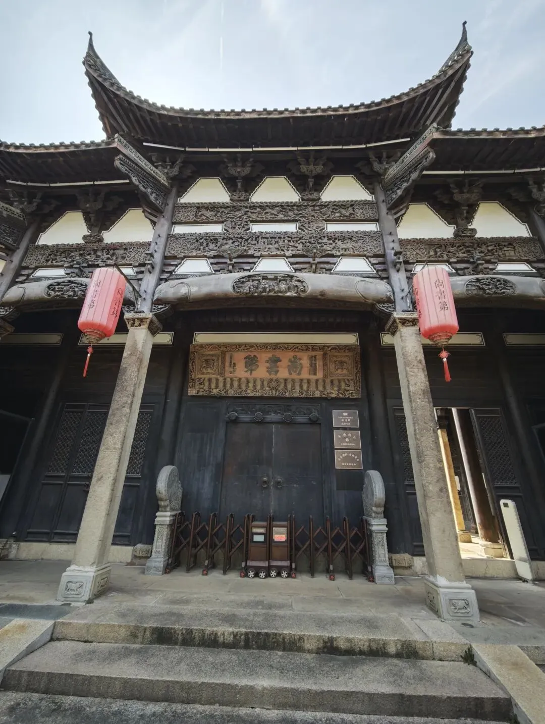 大门两旁红灯笼高悬,匾额内书“尚书第”三字,厚重端方,颇有古意。匾额至门檐之间有三幅横雕,雕刻的人物众多却无一雷同,形态逼真,呼之欲出。