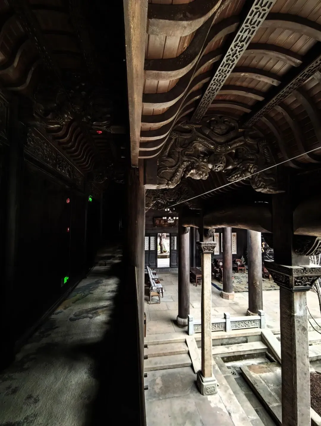 尚书阁为三进院落式,二层高楼。仰头见马头墙高起,青砖灰瓦相映。步至二楼,长廊高大气派,一眼望不到头,一路行来,各式精美的木雕与斗拱足以让你叹为观止。推窗环顾,一座规模宏大,工艺精湛的豪门深宅尽收眼底。