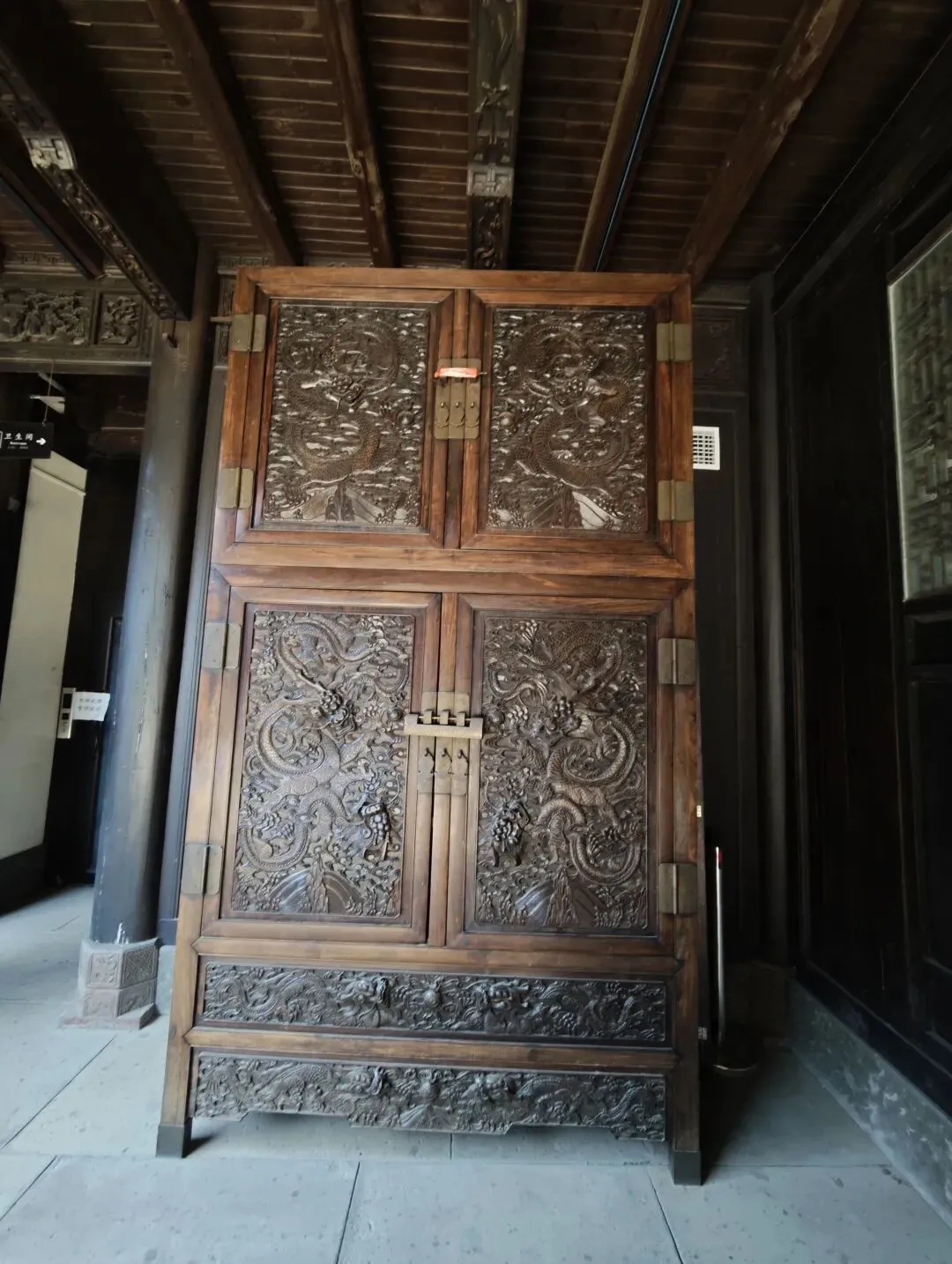 进入三进大门内,见两边各立一大柜,为顶箱柜,分上下两节,对开两门。上面雕龙做工华丽,立体生动。此柜形制高大,高近一丈,差一点就触到房梁了,仰头方可全视。记得《红楼梦》第四十回刘姥姥参观贾母正房后曾惊叹其顶柜又大又高,需用梯子才得上去,这一回我也像刘姥姥进大观园一般长见识了。