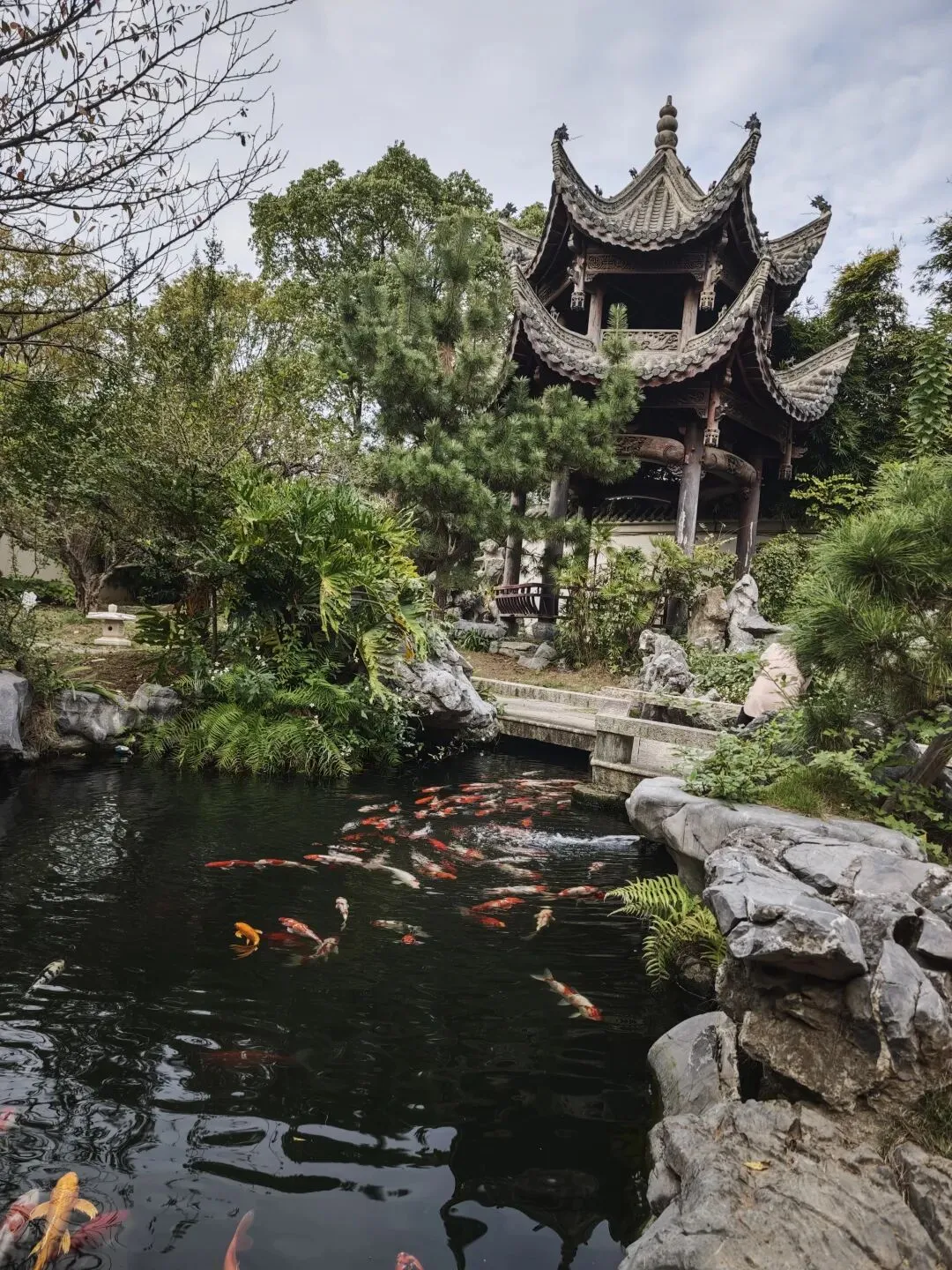 尚书阁旁设有一座小池与闲亭,穿过小桥,绕过假山,坐于精巧雅致的小亭里,闲观游鱼戏水,飞瀑漱石,何其惬意也。