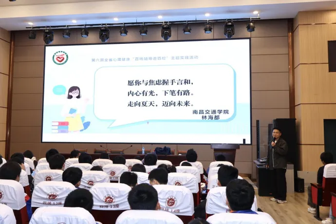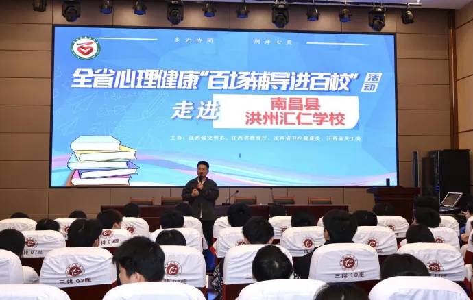 2026年4月10日,由省文明办、省教育厅、省卫生健康委、省关工委主办的第六届全省心理健康“百场辅导进百校”主题实践活动走进南昌县洪州汇仁学校。江西省青少年心理健康教育辅导队成员、南昌交通学院专职心理教师林海都,为南昌县洪州汇仁学校九年级全体师生带来了一场温暖走心、干货满满的专题讲座。熊锋校长对此次活动高度重视、周密安排,并亲临现场聆听讲座。