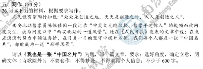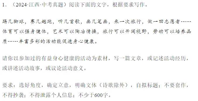 再来看近三年江西中考语文作文题目,我们可以发现,基本都是要求孩子结合自身真实经历写作。无论是写“我也是一张‘中国名片’”,还是“‘以参加过的有益身心健康的活动’为素材写文章”,都在引导孩子从自身经历出发,用文字表达出对生活的感悟。