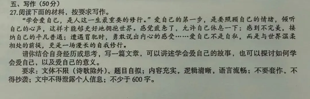 趋势分析:此次一模关注"爱自己",说明命题更加关注青少年心理健康与人格成长。这与教育部强调的"五育并举"及近年来社会对学生心理健康的重视高度吻合。