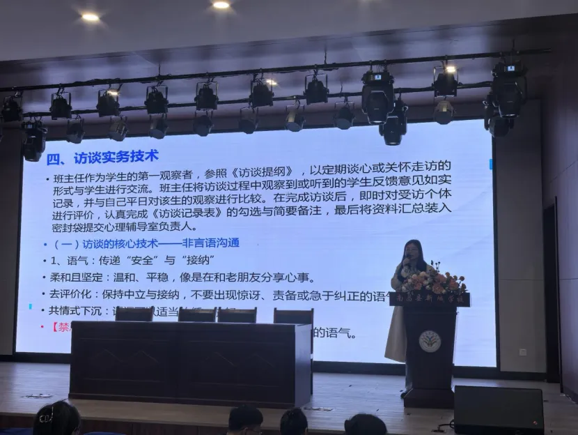 随后,刘倩老师、聂丽老师分别在一部、二部校区开展实务专题培训。培训围绕“2筛”工作核心定义与价值、职责流程、访谈提纲、实务技术、红线伦理等内容展开,详细讲解小学低、中高段及初中各年级访谈要点,示范沟通话术、非言语沟通技巧与记录表填写规范,明确红线处置与平台操作流程。培训内容具体、指导性强,为班主任开展访谈提供清晰指引与实操方法。