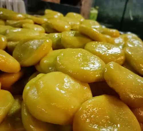 碱水粑这个东西很多人没听过,但它是浮梁人从小吃到大的主食,用米浆加碱水蒸出来,切成片,炒着吃,煮着吃,拌着吃都行,口感很滑,有点像年糕但比年糕更有韧劲,关键是它没什么味道,全靠配菜和调料,这就是本地吃食的特点,不抢戏,但能撑住整个场子。油糍也是这样,糯米粉揉成团,里面包豆沙或者芝麻,下锅炸到金黄,外面脆,里面软,趁热咬一口,油香和甜味一起出来,这种东西你在街边小摊就能买到,两块钱一个,老板娘现炸现卖,你拿着边走边吃,这就是浮梁的日常。