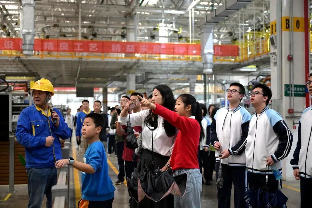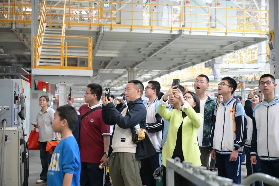 在涂装车间,学生们虽未能进入无尘作业区,但通过视频了解了车身喷涂全流程,并看到了可同时容纳上百辆车的涂装立体库——一切都那么高效、秩序井然。“以前一条生产线要80名工人协作,现在只需几名工作人员就足以管控所有生产制造机器人!一下子少了这么多人,真真切切让我看到,科技正在把传统制造业彻底变个样。”高一(5)班的戴羽艺不禁感慨。