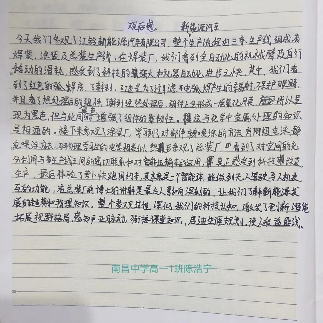 灰砖碧草,白墙蓝衣,处处透露着严谨。这是我来到江铃集团新能源汽车公司的初印象。 随着专业师傅的带领,来到了焊装车间,这是最复杂的全自动立体化车间。沉默的橙色机械臂,像蛰伏的巨兽,吸引我走入亮堂堂的车间。淡黄色的天窗,透下来暖暖的天光,将复杂的白色支架也染上几分温柔。蓝的告示牌、黄的警戒线,将车间密密分割,穿黄蓝工服的工人穿梭其间,被框成零零碎碎的色块。焊接机械臂熟练地丈量着车架,飞溅的火星像喷薄向空中的星星,在车间内此起彼伏。而最颠覆我认知的是:一个庞大的车间,几乎没有浓重的机油味,所有运作着的机器也“合于《桑林》之舞”。 涂装车间须保持无尘,我们无缘亲见。只从视频里看到车身披上崭新漆衣,以及经过一座可同时容纳250余辆车身的长廊立体车库——它高效,沉默,秩序井然。 最后,总装车间是我们行程的最后一站。“无人驾驶汽车正引领三场革命,智能革命、交通革命、能源革命……”工程研究院副院长刘俊宇对我们讲了很多。我们见证了中国汽车走向世界,走进千家万户。共享汽车,智慧交通,未来已来。“……全国哪怕只有百分之一的电动汽车在用电低谷储能,也能极大缓解我国用电高峰压力。”在他身上我看见了对于科学的孜孜不倦,对于民族的自豪认可,对于前路的展望与激情。随后我们走入总装线,试乘的汽车在地面上发出响亮的拐弯声,头顶上正被移动的车架,像在视察我们。它们是欣慰的——因为它们看见了,我们这些少年,也有着同样坚定的信念。