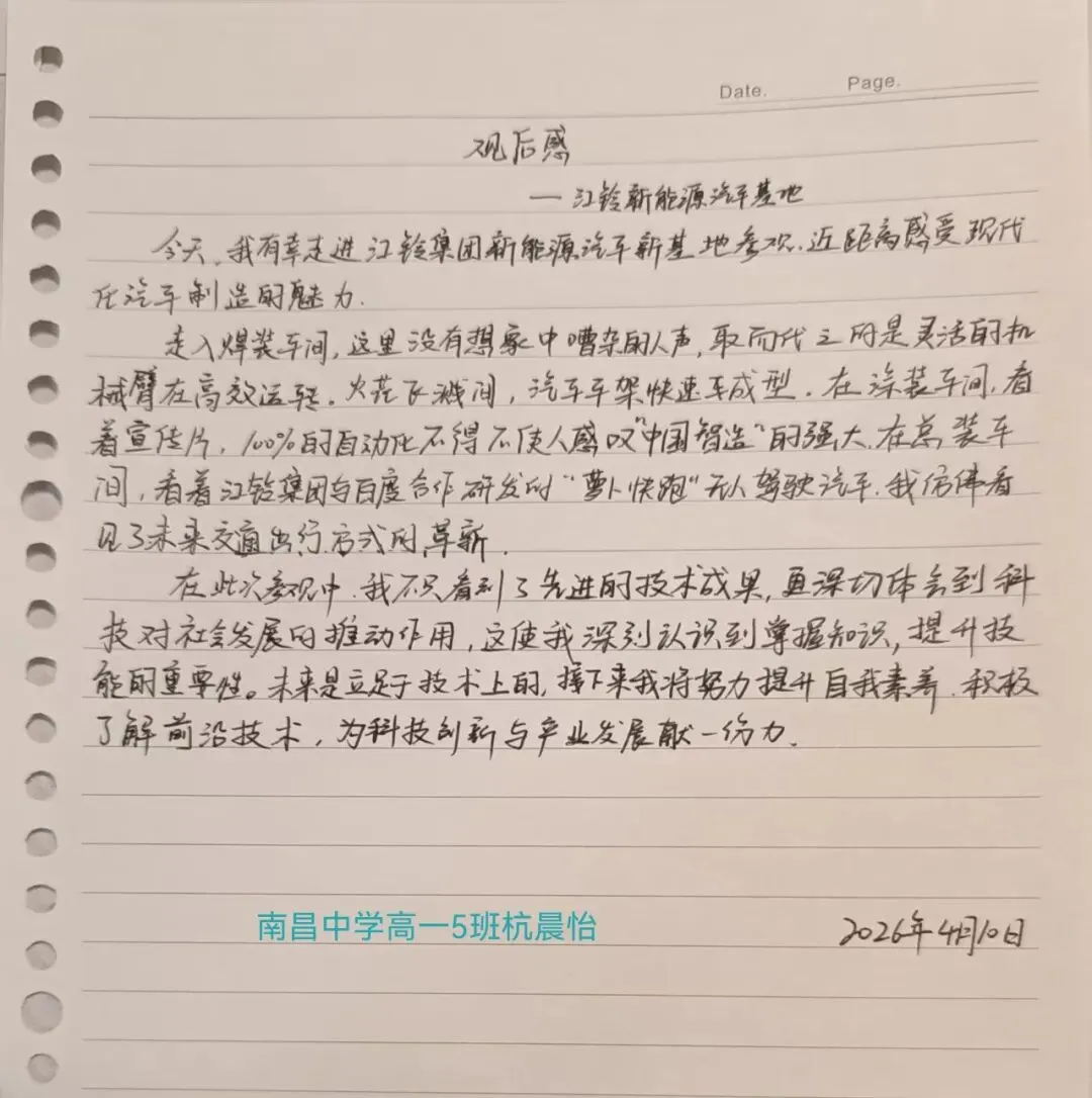 今天,我有幸参观江铃集团新能源汽车有限公司,近距离感受汽车智能制造的魅力,内心满是震撼与感慨,也深刻体会到科技发展的日新月异。 走进生产车间,眼前的景象彻底颠覆了我对传统汽车制造的认知。原本需要大量工人忙碌的生产线,如今被一个个精准灵活的机器人取代。机械臂有条不紊地完成焊接、装配等一系列工序,动作流畅高效,整个车间井然有序,尽显智能化生产的先进。工作人员介绍,以往一条生产线需要80名工人协作,如今仅需几名掌握机器人编码技术的人员就能管控,巨大的人员缩减,让我真切看到科技对传统制造业的彻底重塑。 “不好好学习,以后螺丝都没得拧。”工作人员的这句话朴实却发人深省。在智能化时代,简单重复的体力工作逐渐被机器人替代,没有扎实的知识和专业技能,终将被时代淘汰。同时,我们还了解到“萝卜快跑”项目,得知五年后无人驾驶汽车将走进千家万户,自动驾驶的汽车将被普及,这更让我惊叹于科技发展的速度,未来出行方式即将迎来全新变革,我们的生活也将迎来巨大的变化。