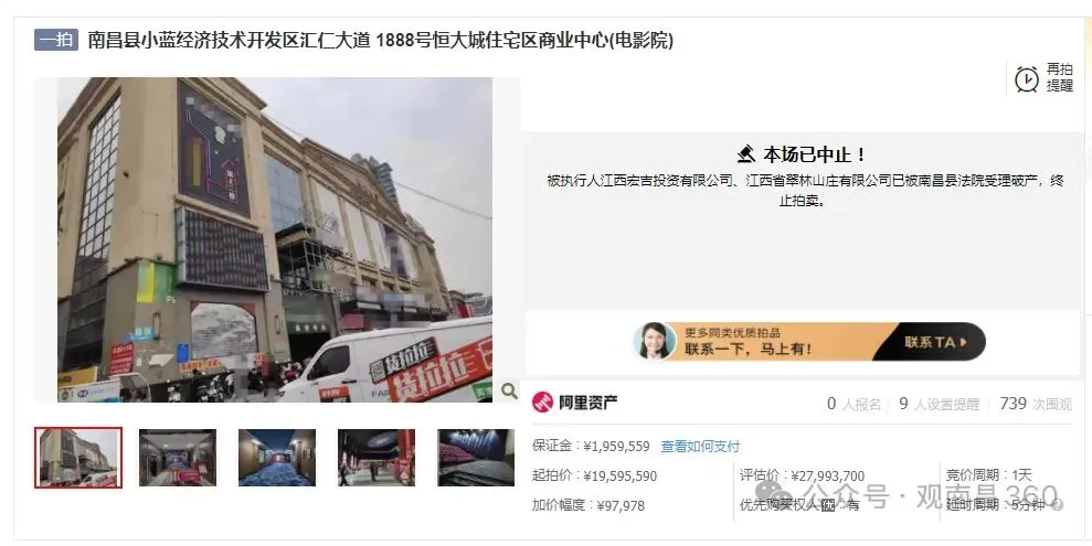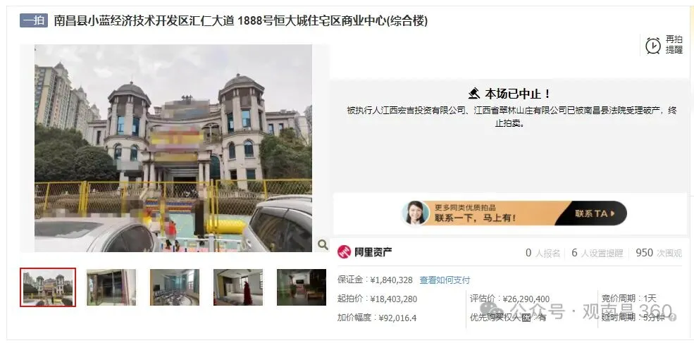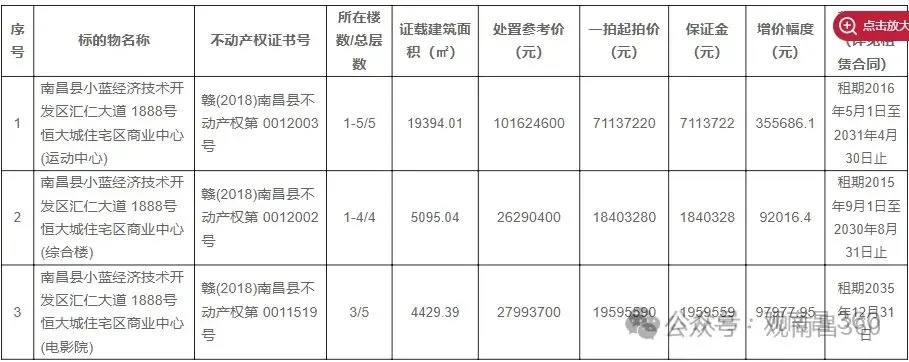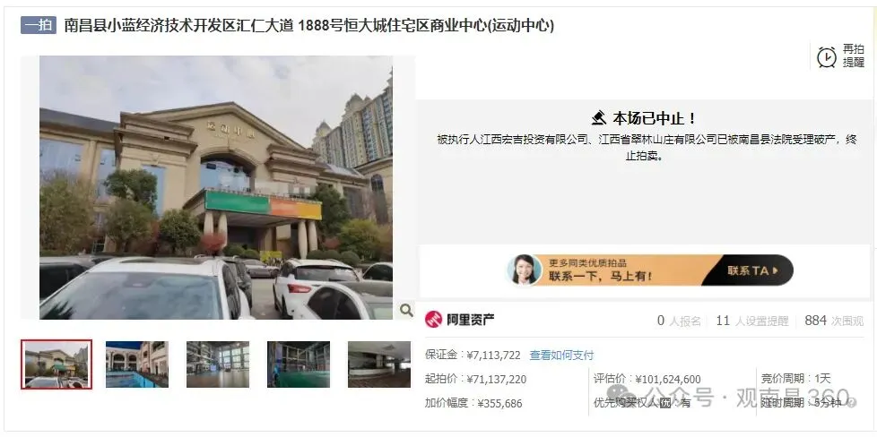 南昌县小蓝经济技术开发区汇仁大道1888号恒大城商业中心相关资产拍卖突发中止,原计划4月10日开拍的3个核心标段(运动中心、综合楼、电影院)全部终止,涉拍总起价超1.09亿元。