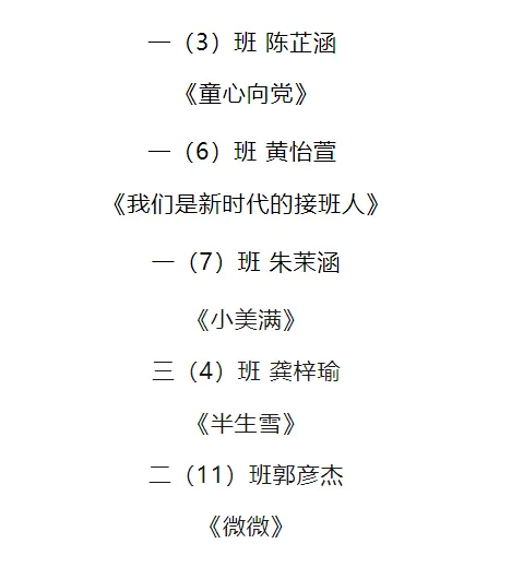 1-3年级优秀演唱奖: 姬言蹊、江莜妤、徐誉轩、饶嫣然、(周泽芮、罗紫萱、邹楚恬、陶思妤 )、万馨羽、(黄珂宁、喻奕可、徐梓芸、陈昊晗 )