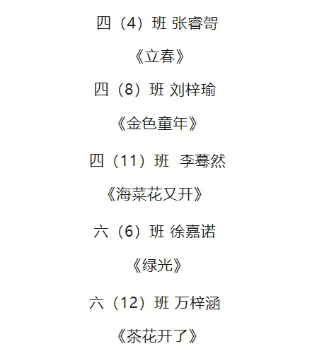 徐嘉骏、袁浩轩、彭心慰、程若溪 、(万承希、简欣怡、梅辰)、(郑心颖、陈嘉美、陈予诺、王诗晴) (鹿晨雯、肖一一、樊子萱、周芮)