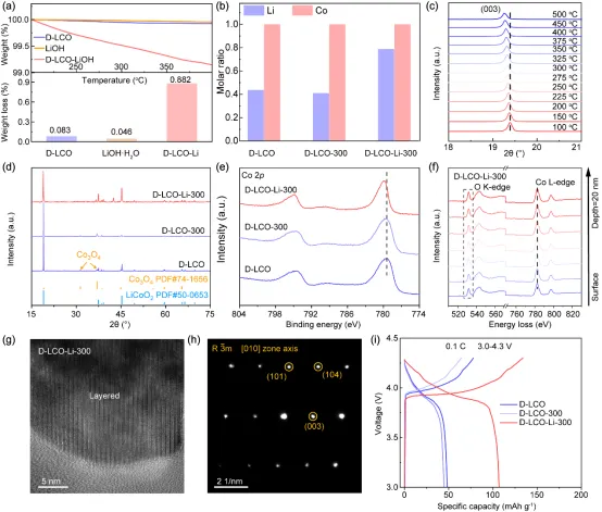 图 1 低温下SP-LP相变的表征。(a) D-LCO、LiOH・H2O及D-LCO-Li的热TG曲线及对应的质量损失;(b) D-LCO、D-LCO-300、D-LCO-Li-300的ICP-OES测试结果;(c) D-LCO-Li加热过程中的原位XRD图谱;(d) D-LCO、D-LCO-300与D-LCO-Li-300的XRD图谱;(e) D-LCO、D-LCO-300与D-LCO-Li-300的Co 2p XPS谱;(f) D-LCO-Li-300的EELS线扫谱图;(g) D-LCO-Li-300 的HRTEM图像;(h) D-LCO-Li-300沿[010]晶带轴的SAED图谱;(i) 3.0~4.3 V电压区间、0.1 C倍率下,D-LCO、D-LCO-300与D-LCO-Li-300的恒电流充放电曲线。