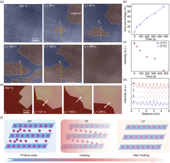 图 2 原位加热TEM下的SP-LP相变过程。(a) 300 ℃加热过程中,D-LCO内LP区域生长与融合的时间分辨HRTEM图像;(b) 对应 (a) 的LP区域占比随时间的变化曲线;(c) 对应 (a) 的快速傅里叶变换(FFT)图谱中,尖晶石相 (111) 与 (-1-1-1) 晶面衍射斑的强度随时间的变化曲线;(d) 沿 (a) 中橙色标线的晶格强度分布曲线;(e) 300 ℃加热过程中,层状相结构振荡生长的时间分辨iFFT图像;(f) 相变过程的示意图。