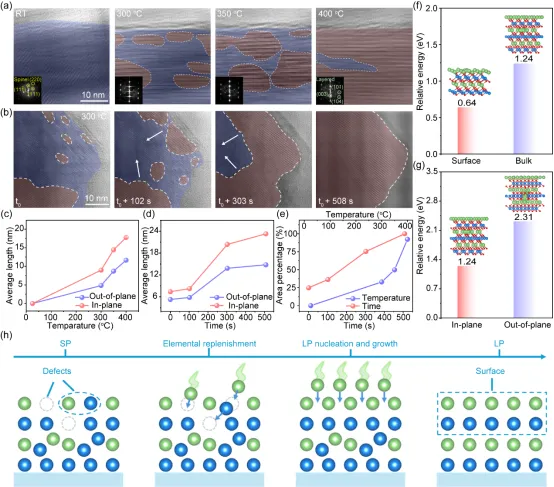 图 3 SP-LP相变的微观尺度特征。(a) 300~400 ℃低温区间内,SP-LP相变的原位HRTEM图像,插图为对应的FFT图谱;(b) 原位加热过程中,揭示相变方向(从表面向体相)的时间分辨HRTEM图像;(c) 对应 (a) 中层状相区域的平均长度统计;(d) 对应 (b) 中层状相区域的平均长度统计;(e) 对应 (a)、(b) 中,层状相区域占比随温度、时间的变化曲线;(f) 锂离子在LCO表面与体相中的扩散能垒及迁移路径;(g) Li+在面内与面外方向的扩散能垒及迁移路径;(h) SP-LP四步相变机制的对应示意图。