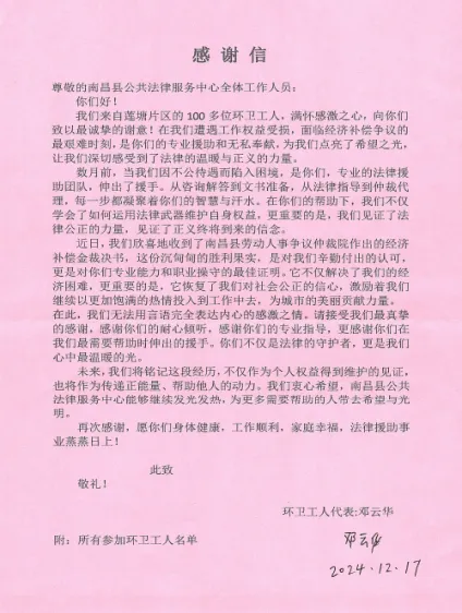 在县劳动人事争议仲裁院法律援助工作站派驻值班律师是我县开展“有法帮你 薪暖农民工”法援惠民生专项行动的重要举措。一直以来,南昌县法律援助中心重点关注农民工讨薪及工伤赔偿案件,开辟农民工法律援助绿色通道,切实做好农民工及困难人群劳动争议法律援助工作。2024年至今,我县共办理劳动者维权法律援助案件493件,开展“薪暖农民工”等法律服务宣传活动10场次,接待农民工法律咨询3600余人次。法律援助中心和援助律师以热情的服务态度、专业的法律素养、耐心的答疑解问得到了受援人的高度评价,并先后多次收到受援人赠送的感谢信和锦旗!