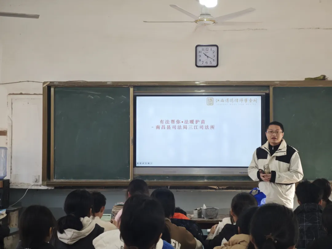为加强宣传《中华人民共和国未成年人保护法》,防范校园霸凌,提升未成年人法律意识,倡导未成年人运用法律武器保护自己,2024年12月4日, 南昌县三江司法所联合江西博德律师事务所来到三江中学组织开展了“有法帮你·法暖护苗”宣讲活动。