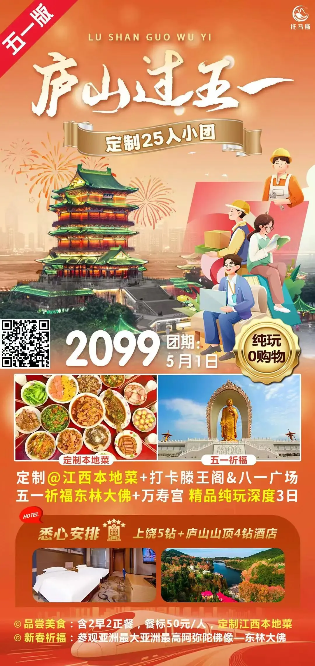 五一奔赴庐山,不再是匆匆打卡。这趟 25 人小团深度之旅,把南昌的城市烟火、庐山的山水禅意、东林大佛的庄严祈福,都揉进了 3 天的行程里。从滕王阁的千古绝唱,到东林大佛的佛光普照,再到庐山的云雾奇峰,一次解锁赣鄱大地的人文与自然。