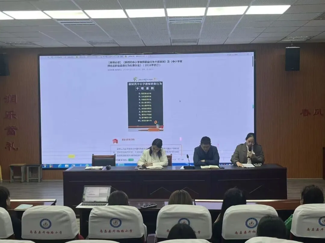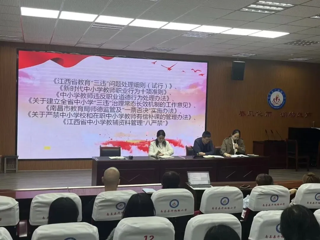 工会主席黄文静同志解读工作方案,明确“以生为本”育人理念,锚定“三项违规”存量清零、增量为零目标,重申“三个严禁”红线要求。全体教职工集中学习《江西省教育“三违”问题处理细则(试行)》、《新时代中小学教师职业行为十项准则》、《中小学教师违反职业道德行为处理办法》、《关于建立全省中小学“三违”治理常态长效机制的工作意见》、《南昌市教育局师德监管及“一票否决”实施办法》、《关于严禁中小学校和在职中小学教师有偿补课的管理办法》、《江西省中小学教辅资料管理“八严禁”》等相关文件,进一步明晰违规界定与处理标准,强化纪律意识与廉洁从教理念。