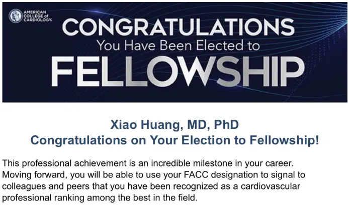 (王文英报道)近日,南昌大学第二附属医院心血管内科黄晓教授被授予美国心脏病学院(American College of Cardiology,ACC)资深专家会员(Fellow),以肯定其在心血管病学领域所作出的突出贡献。