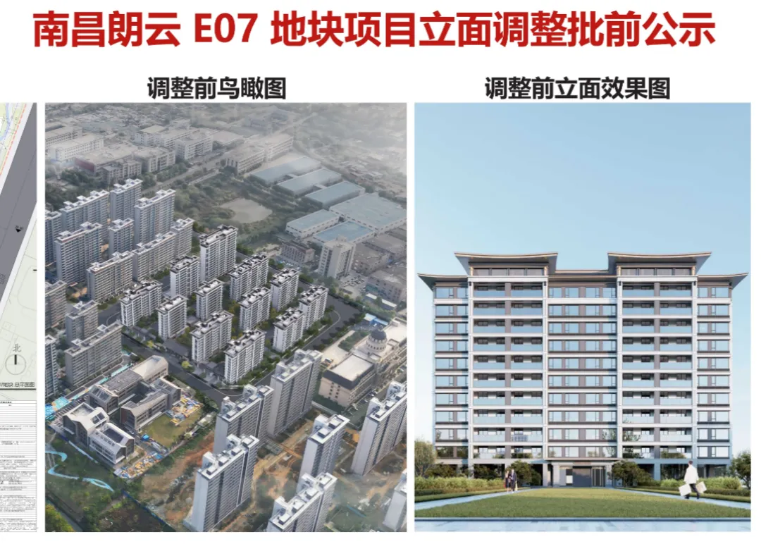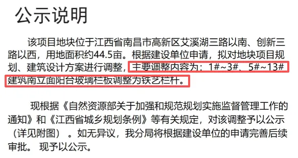 近日,南昌市自然资源和规划局发布了《南昌朗云E07地块项目调整批前公示》。公示显示,南昌朗云 E07 地块项目拟将原本规划设计的南立面阳台玻璃栏板全部调整为铁艺栏杆,这一处细节的变更,肉眼就能看出质感差异。