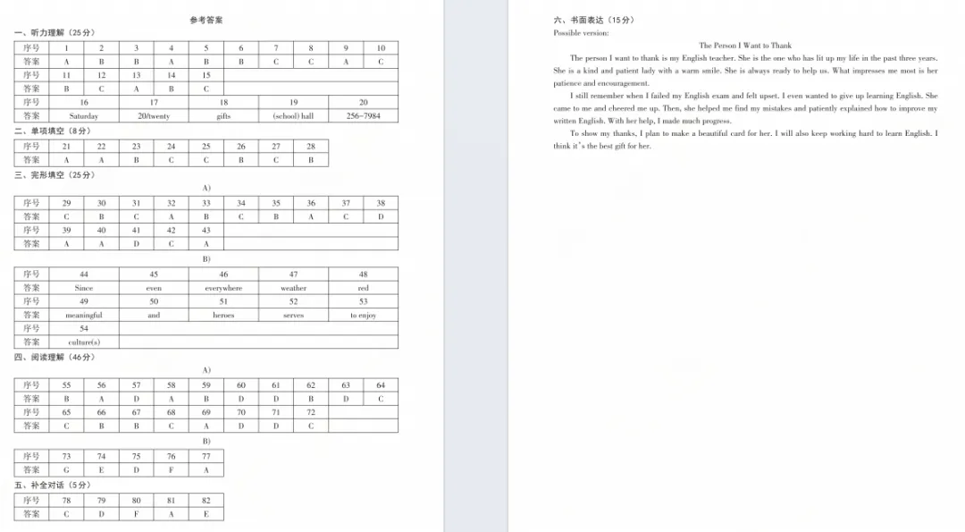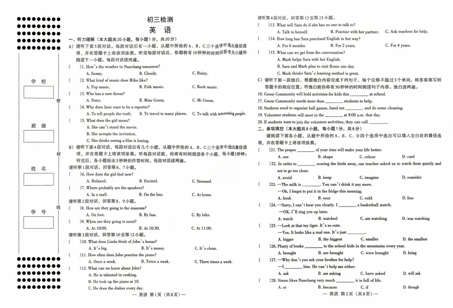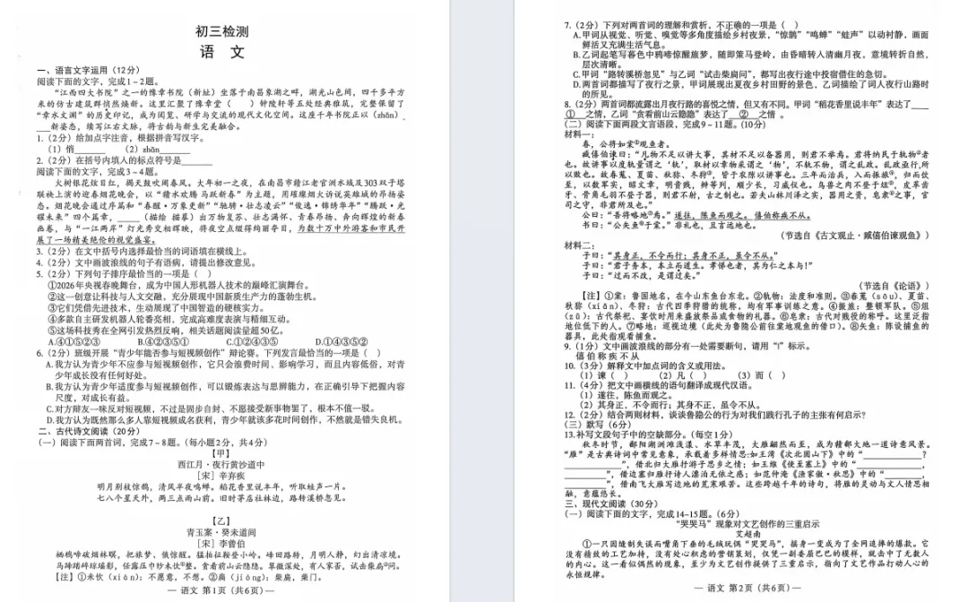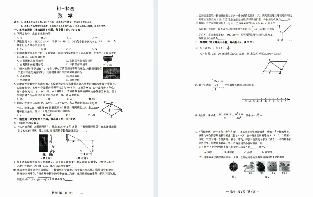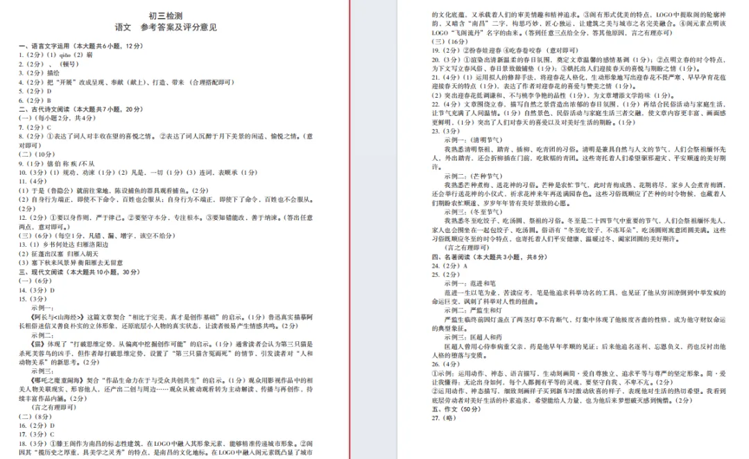 2026年南昌初三一模数学、语文、英语试题答案已更新