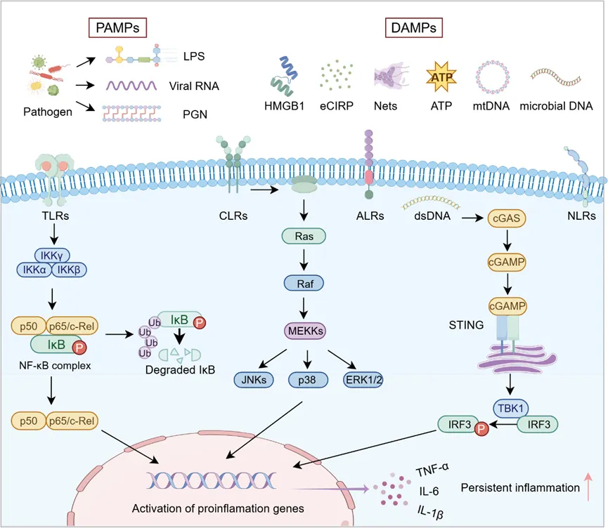 持续性炎症是PICS患者的核心临床特征,其严重程度与死亡率密切相关。在脓毒症中,先天免疫系统的模式识别受体(PRRs)通过识别病原相关分子模式(PAMPs)和损伤相关分子模式(DAMPs),激活NF-κB、cGAS-STING等下游信号通路,引发级联炎症反应。在脓毒症后期,尽管抗生素治疗使PAMPs水平显著下降,但DAMPs的持续存在是驱动PICS慢性炎症的关键。例如:释放到胞外的氧化型HMGB1、胞外冷诱导RNA结合蛋白(eCIRP)、胞外ATP及线粒体DNA(mtDNA)等,持续通过TLR4、NLRP3炎症小体或cGAS-STING通路激活免疫细胞。这种PAMPs和DAMPs的持续刺激最终导致免疫细胞陷入“免疫瘫痪”并诱发免疫耐受。尽管靶向抑制DAMPs在动物模型中显示出减轻炎症的潜力,但其在PICS患者中的确切作用仍需大规模队列研究验证。
