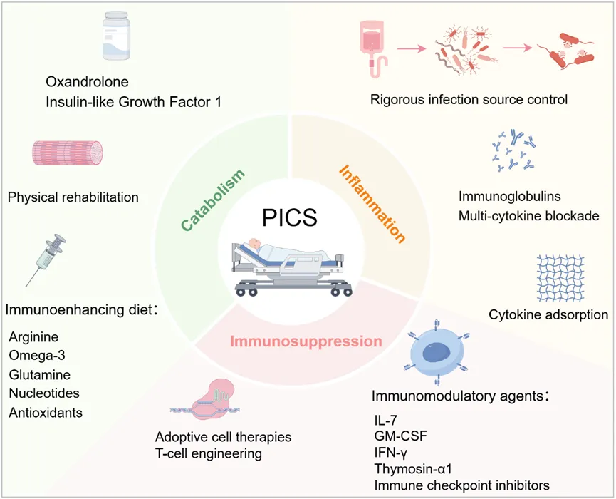 总体而言,将抑制炎症、挽救免疫和逆转分解代谢进行协同整合,是PICS的潜在治疗途径。由于现有策略多从烧伤或肿瘤领域外推而来,未来仍需在PICS的专病临床队列中验证其确切疗效。
