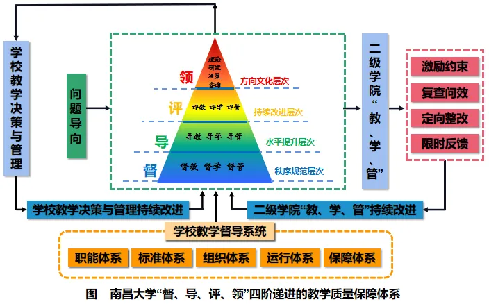 进入新时代,全社会对高等教育人才培养的质量提出了新的更高的要求,建立科学有效的教学质量保障体系是摆在高校面前的一个重要课题。南昌大学紧紧围绕立德树人根本任务,牢固树立人才培养的中心地位、教育教学的基础地位和本科教学的优先地位,以培养德智体美劳全面发展的时代新人为目标,以《深化新时代教育评价改革总体方案》为引领,致力于完善内部治理体系建设,改进督导评价制度机制,打造“督、导、评、领”四阶递进的保障体系,为构建高质量人才培养体系迈出了坚实的步伐,取得了可喜成效。(一)优化治理结构,成立本科生院,形成“质量共治”格局学校基于“质量共治”理念优化内部治理结构,以学生成长成才为中心成立“本科生院”,充分发挥招生就业处、学生工作处、教务处等职能部门和校、院两级教学督导组织的作用,形成从招生到培养、再到毕业就业“全链条、一体化”的管理模式,以及质量监督与评价“全程、全员、全方位”的协同机制。该治理体系融入了“管办评分离”的治理理念,即本科生院行使管理职能,二级学院为办学主体,独立第三方的教学督导主导质量监测与评价工作。(二)构建“督、导、评、领”四阶递进的本科教育教学质量保障体系针对不同层次的质量需求,构建“督、导、评、领”四阶递进的教学质量保障体系,一是“督”:对课堂、考试等教学各环节进行全过程监督检查,确保教学规范有序。二是“导”:针对“督”中发现的问题,及时与质量主体沟通、交流,提出改进意见。三是“评”:对课程授课质量、专业建设水平、学院教学工作状态,定期开展全覆盖评估,在此基础上撰写全校本科教学质量报告。四是“领”:根据评估情况选取重大问题开展调研,形成调研和咨询报告,发表研究论文,出版督导专著或论文集5部,引领教学改革方向和质量文化形成。