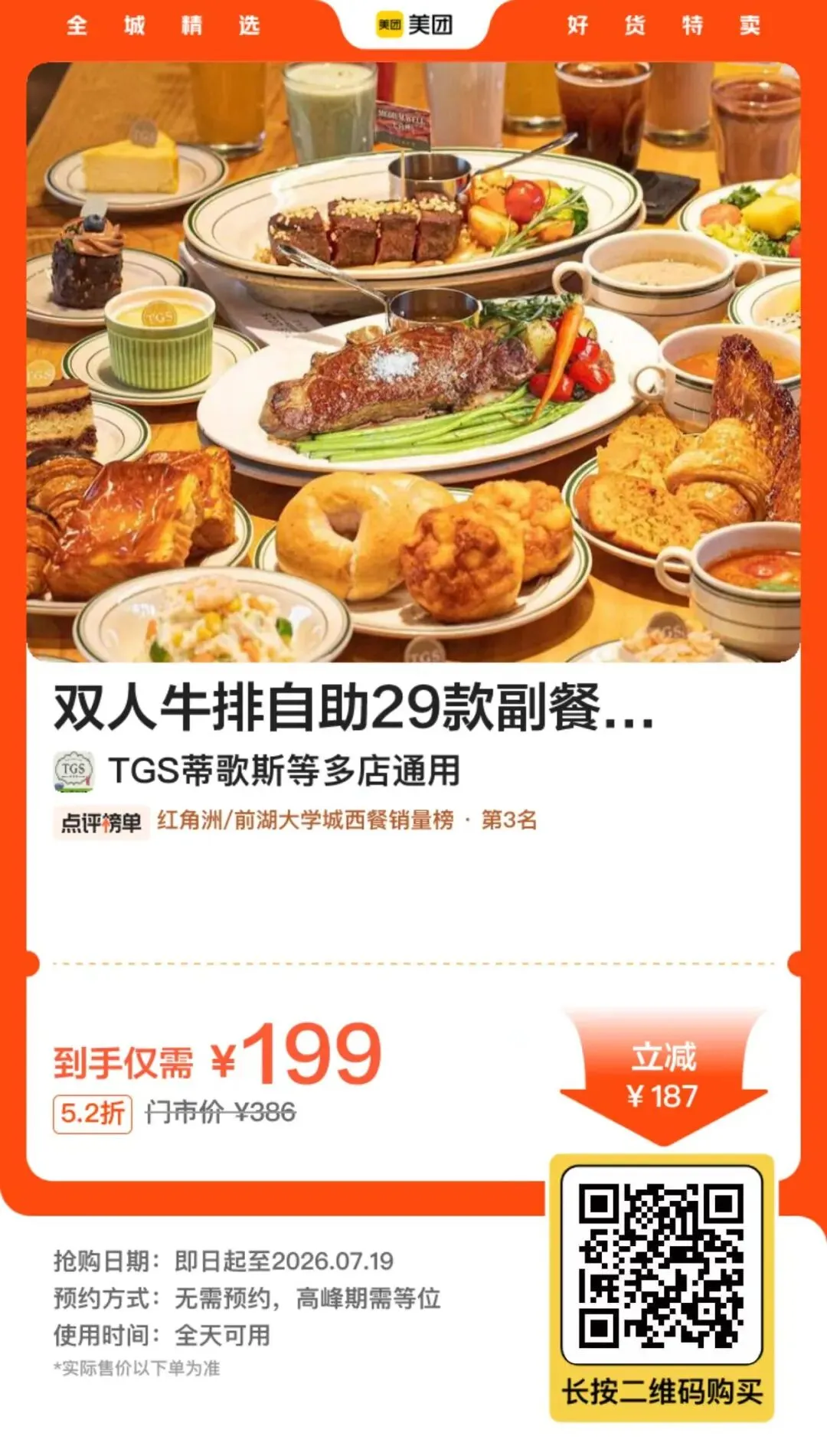 南昌必吃榜西餐厅「TGS蒂歌斯」双人牛排自助!29款副餐无限吃仅199!