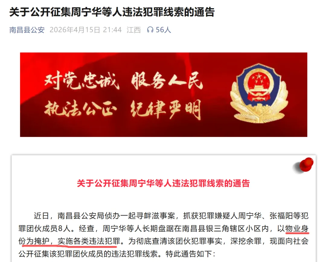 4月15号,南昌县公安局一纸通告,周宁华、张福阳等8人犯罪团伙被端了。他们打着物业的旗号,在南昌县银三角那片小区里为非作歹,干的都是见不得光的勾当。