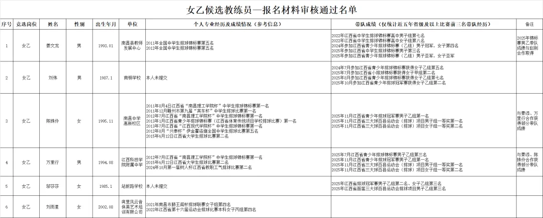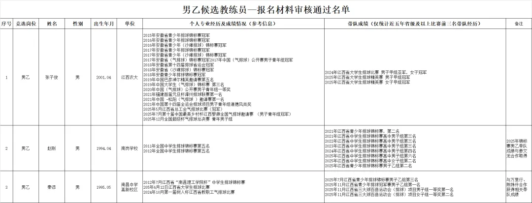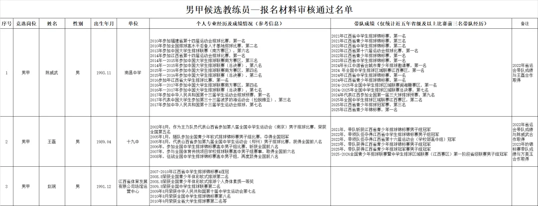 南昌市青少年排球精英队候选教练员名单公示