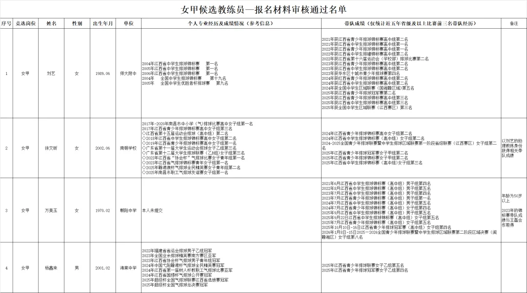>南昌市青少年排球精英队候选教练员名单公示