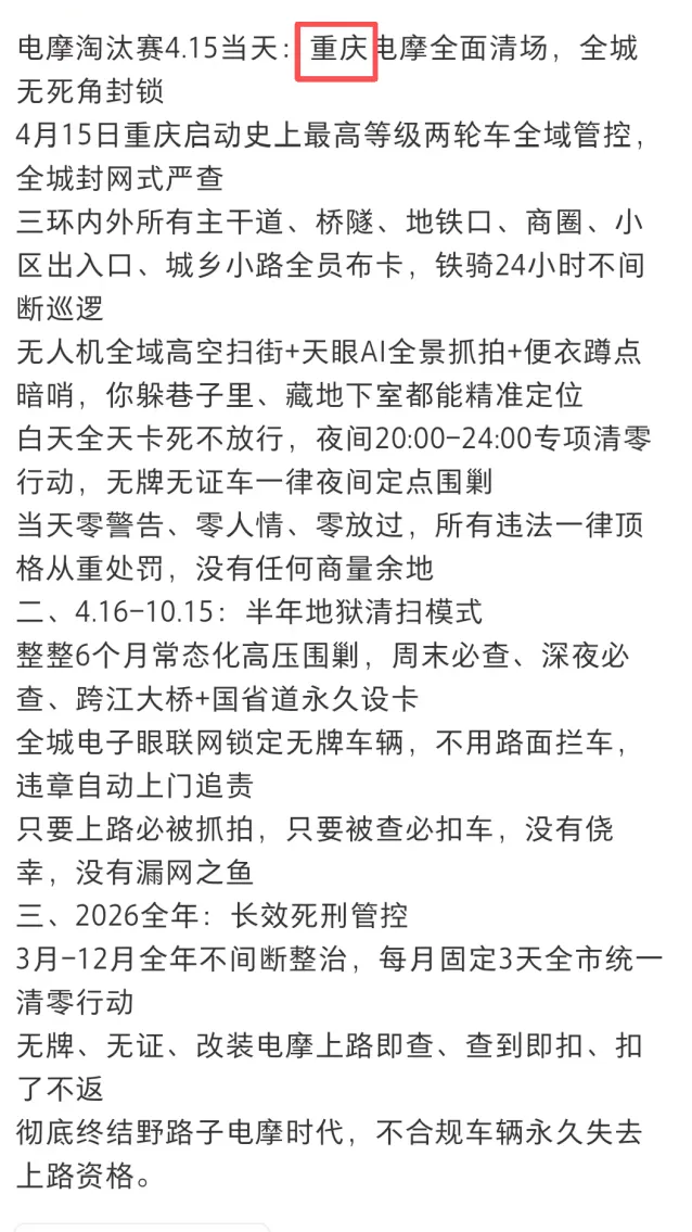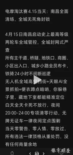 近日,明鉴君发现一则“电摩淘汰赛4.15当天:南昌全面清场,全城无死角封锁”的消息在网络上传播。消息声称“南昌4月15日启动史上最严两轮车全域管控,全城封网式严查,对违法车辆顶格处罚;4月16日起开展半年地狱清扫模式,电子眼自动追责、上路即扣车;2026全年持续整治,长效死刑管控。”