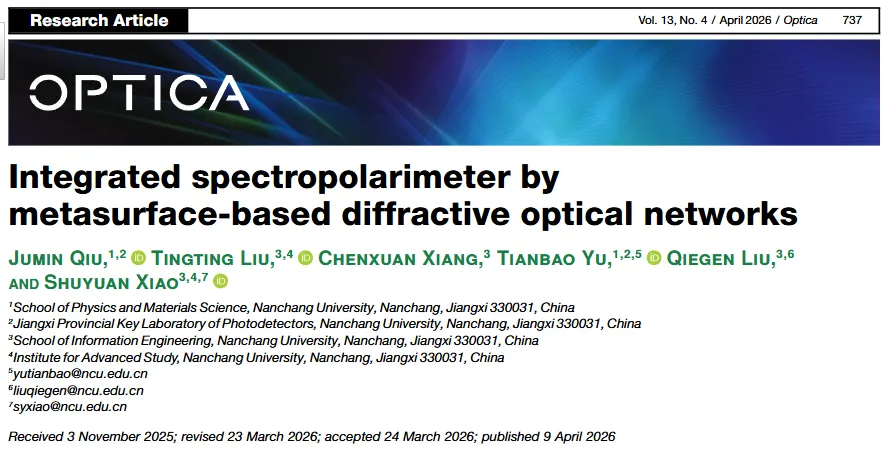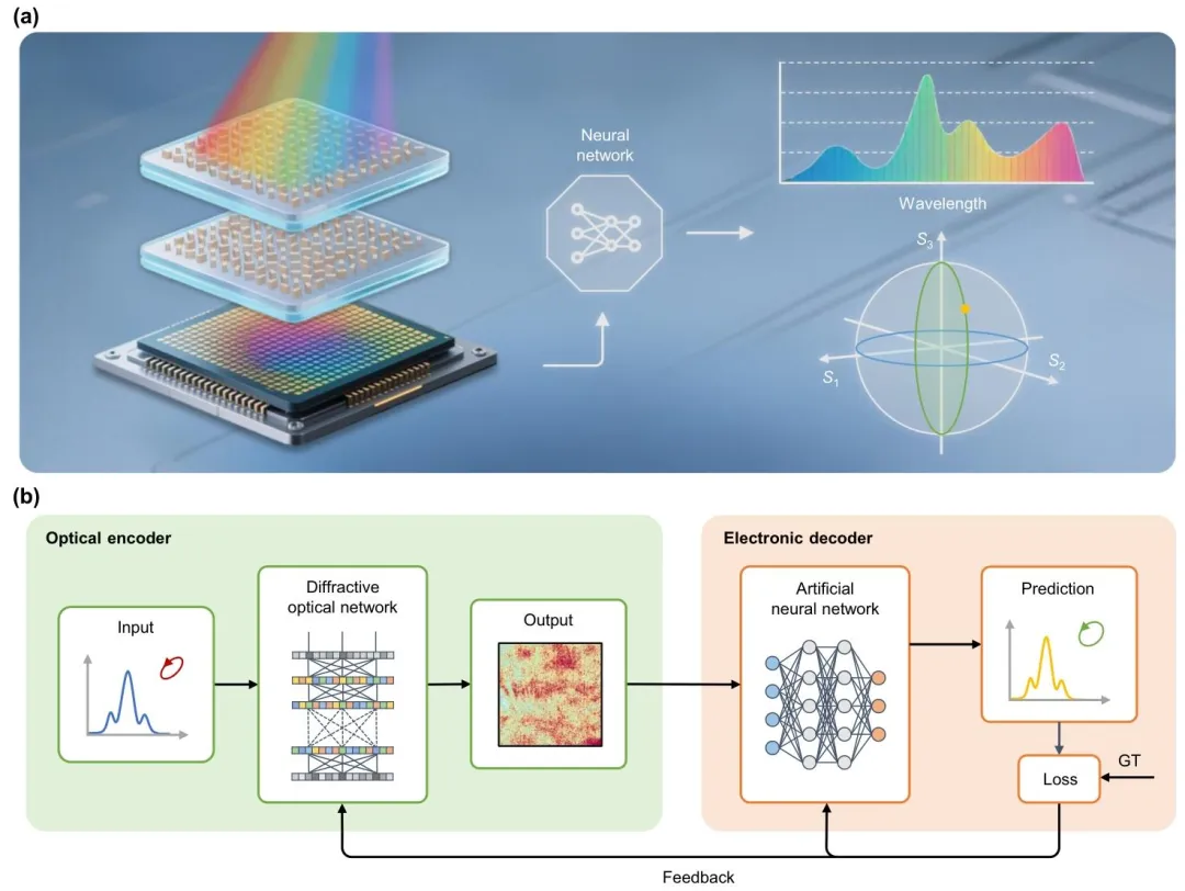 本研究由南昌大学于天宝教授团队,首次提出基于超表面衍射光学网络(DON)的集成光谱偏振仪,利用超表面对波长与偏振的协同相位调制,将光谱与偏振信息编码为空间光强分布,通过联合优化的深度学习网络解码,实现单次曝光同步高精度重构光谱与全斯托克斯参数,并成功研制芯片集成式传感器原型。该器件无机械扫描、无分立元件,实现紧凑型片上多维光传感,在生物医学诊断、工业计量与通用光传感领域具备重要应用价值。