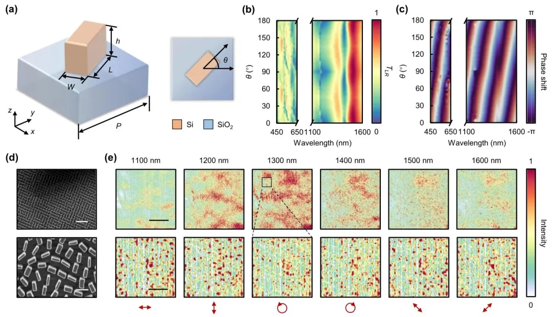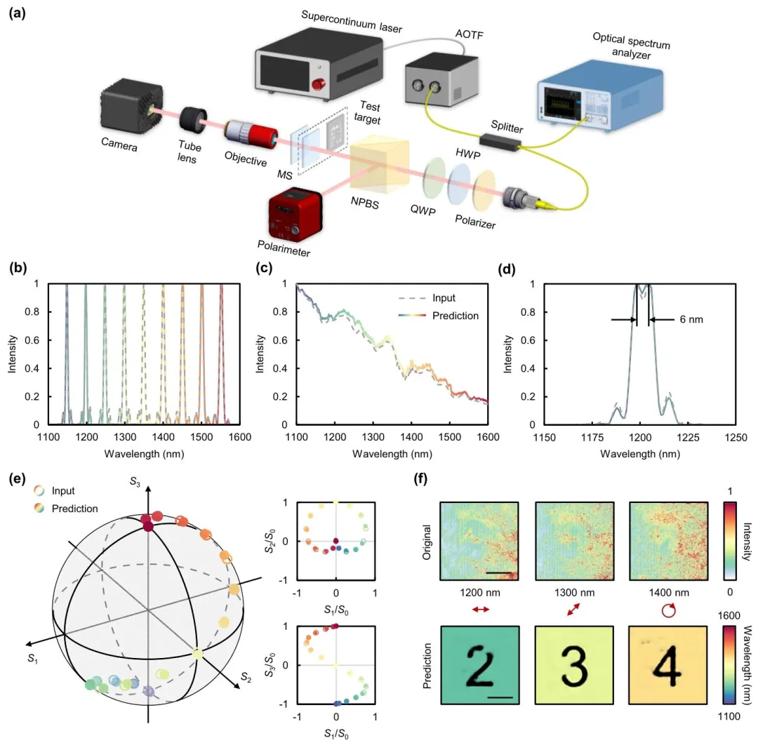 超表面单元为二氧化硅衬底上的硅纳米砖,周期 600 nm,通过宽度、长度与旋转角实现 0~2π 全相位覆盖与偏振依赖调制。实验在近红外 1100~1600 nm 波段验证:离散窄带光谱重构平均绝对误差(MAE)低至 0.004,宽带光谱重构 MAE 为 0.031,可分辨 6 nm 的双谱峰;全庞加莱球偏振态重构的斯托克斯参数平均 MAE 为 0.016,实现高精度偏振测量。成像实验中,不同波长 - 偏振编码的数字图案可被清晰重构,图像均方误差低至 0.004,验证系统的多维成像能力。