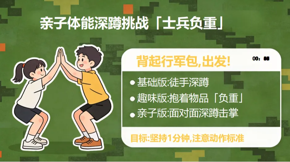 夜幕降临,一场别开生面的“爱我国防·体能砺行”亲子国防体育线上微课堂在家庭中温馨开展。本次微课由学校联合少年军校共同推出,旨在通过“家校社联动”,将国防教育延伸至家庭,让家长与孩子共同“打造身体里的国防系统”。微课中,家长和孩子一同观看了解放军训练集锦,明白了“强大的体能+坚韧的意志”是军人完成任务的核心支撑。随后,全家参与“亲子体能深蹲挑战”:基础版徒手深蹲、趣味版“负重”深蹲(抱书本或玩具)、亲子版击掌深蹲,在1分钟的坚持中感受“士兵负重”的艰辛。微课还推荐了“7天迷你行动”计划,鼓励家庭通过平板支撑、传球游戏等日常运动,将“每天2小时体育锻炼”的教育部要求转化为生活习惯。