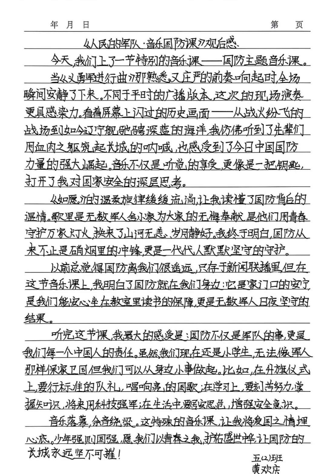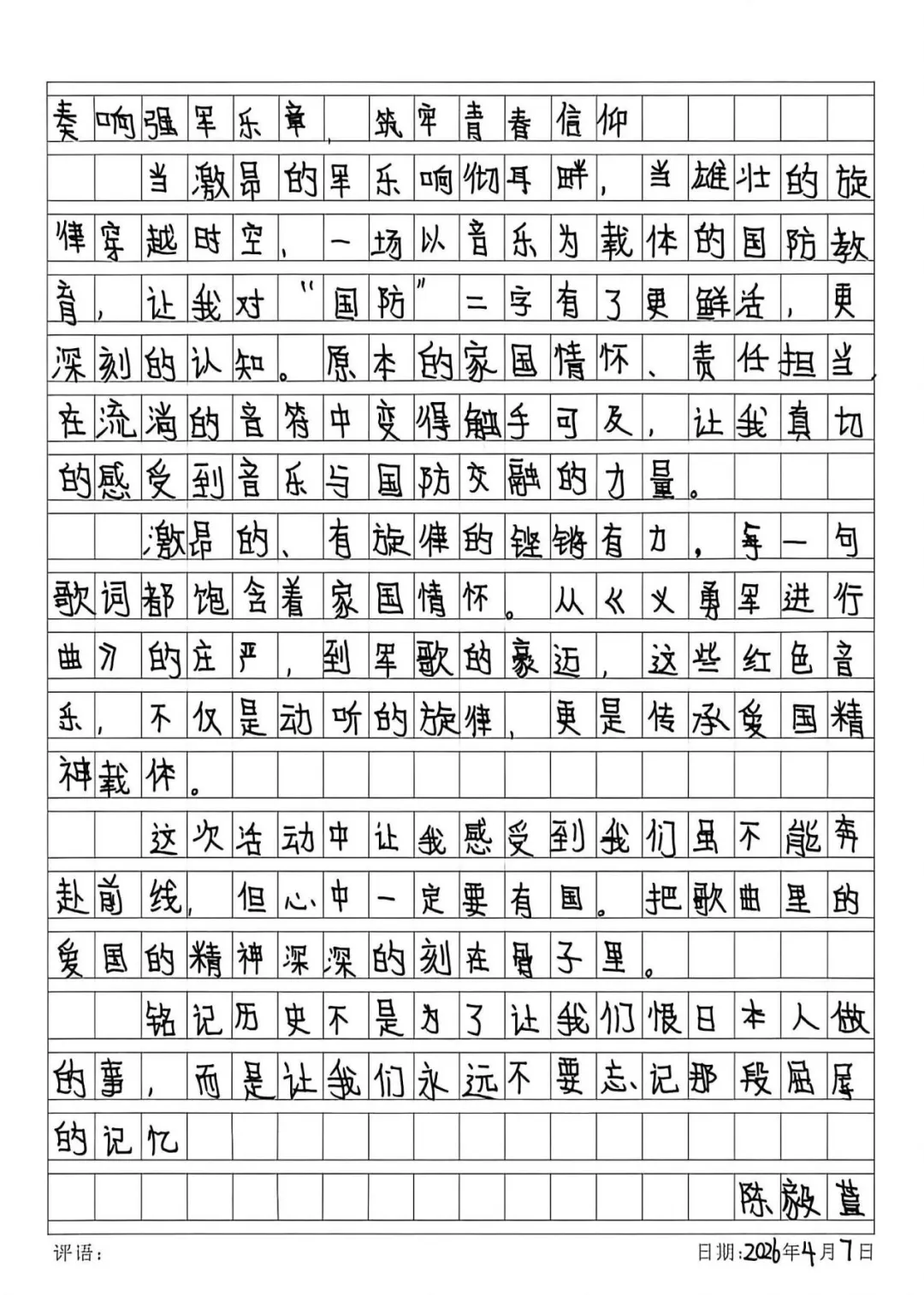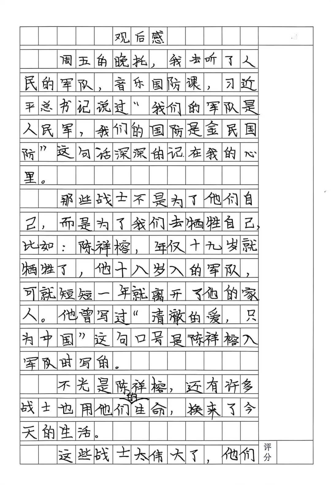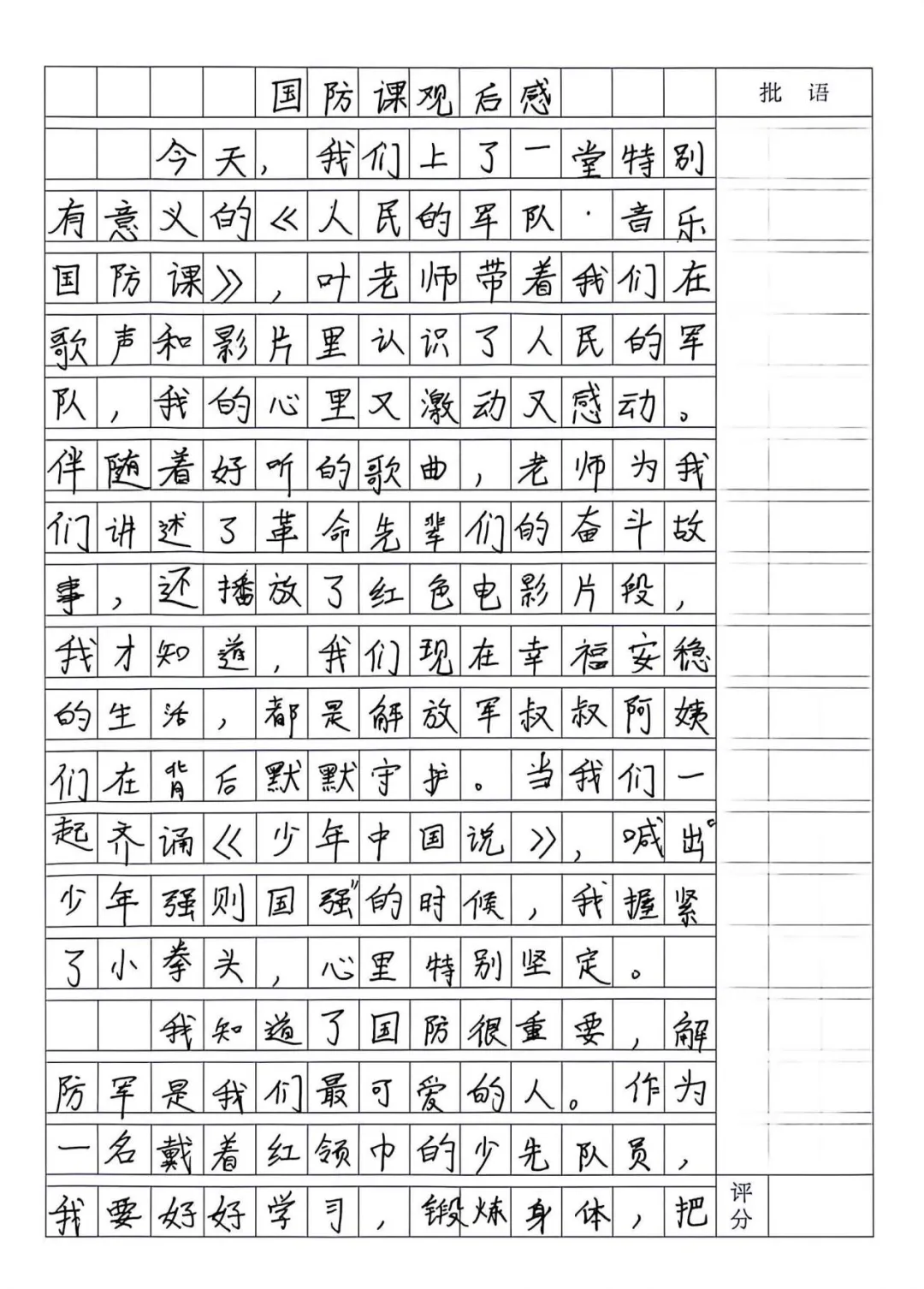 当一首首军歌在耳畔响起,当一幕幕英雄的画面在银幕上重现,许多队员的眼眶不知不觉湿润了。有的孩子紧紧攥着胸前的红领巾,有的悄悄抹去眼角的泪花,更有人跟着旋律轻声哼唱,声音里满是坚定与崇敬。这堂有温度、有力量的音乐国防课,让强军的火种在每一颗幼小的心房中熊熊燃烧。课后,孩子们久久不愿离去,他们拿起笔,把满腔的感动与决心写进一篇篇观后感里——那些稚嫩却滚烫的文字,是国防种子已然扎根的最好证明。