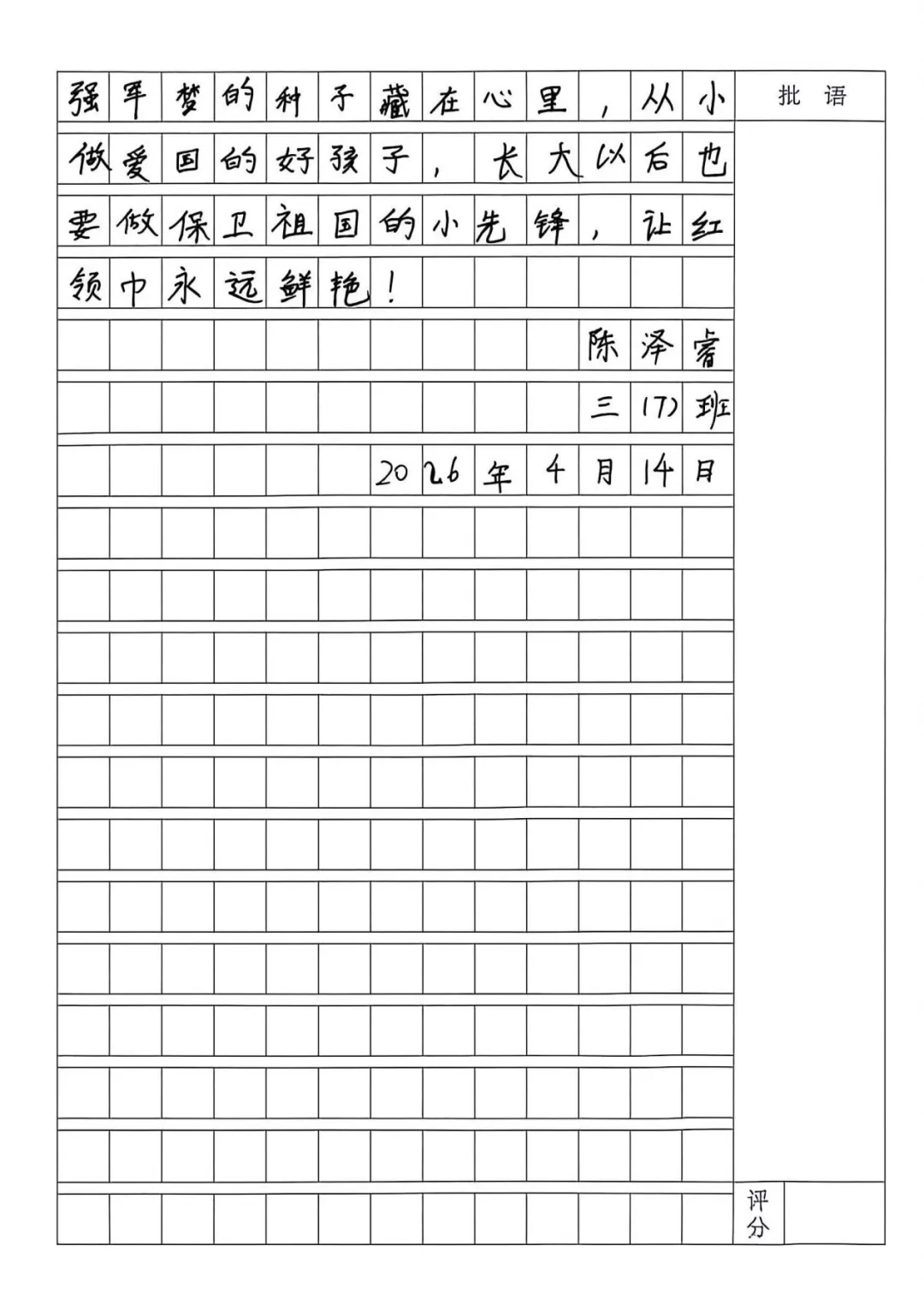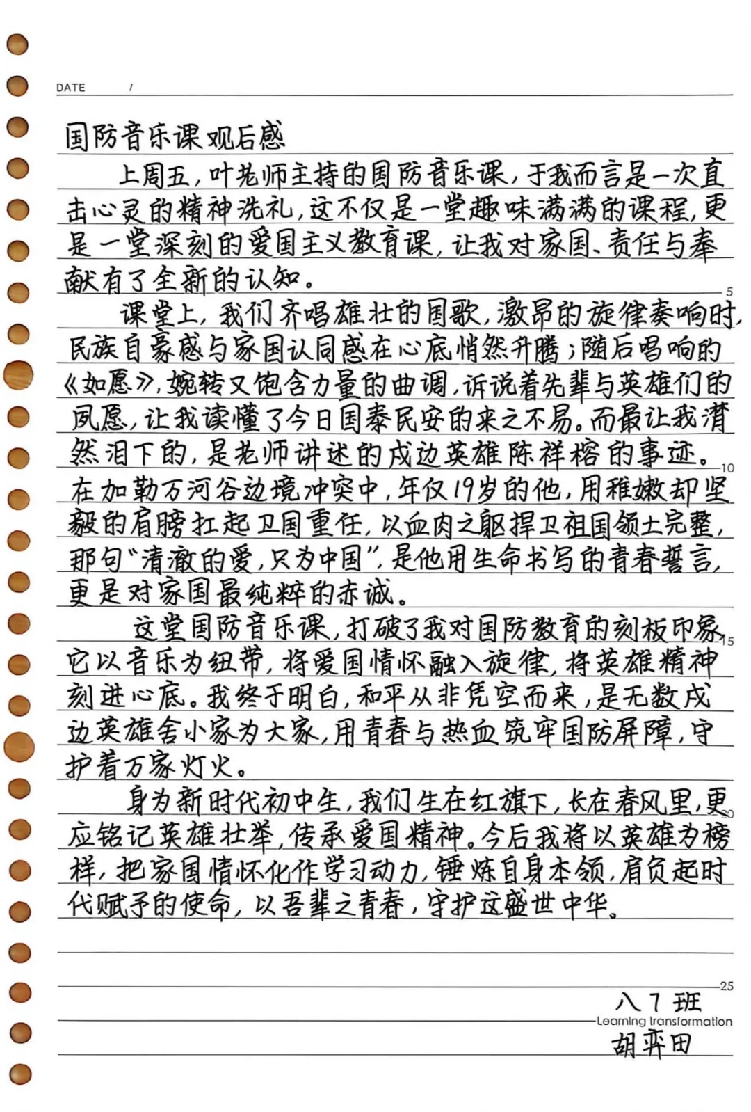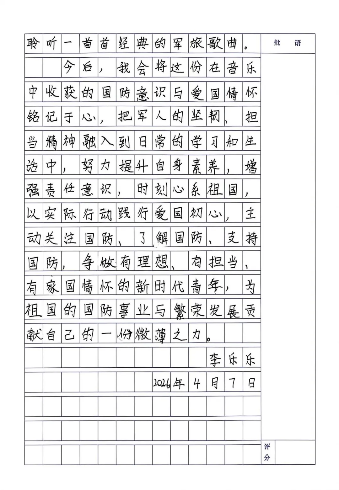 当一首首军歌在耳畔响起,当一幕幕英雄的画面在银幕上重现,许多队员的眼眶不知不觉湿润了。有的孩子紧紧攥着胸前的红领巾,有的悄悄抹去眼角的泪花,更有人跟着旋律轻声哼唱,声音里满是坚定与崇敬。这堂有温度、有力量的音乐国防课,让强军的火种在每一颗幼小的心房中熊熊燃烧。课后,孩子们久久不愿离去,他们拿起笔,把满腔的感动与决心写进一篇篇观后感里——那些稚嫩却滚烫的文字,是国防种子已然扎根的最好证明。