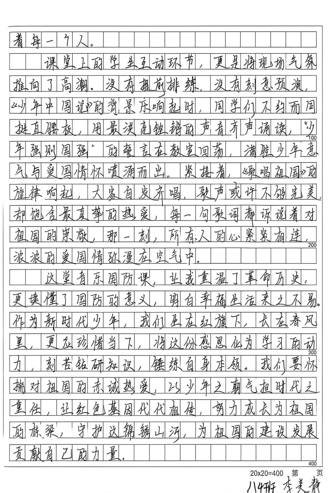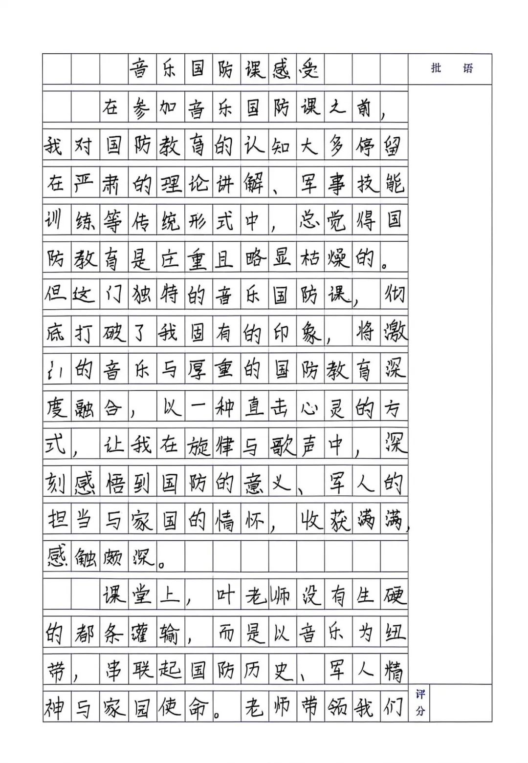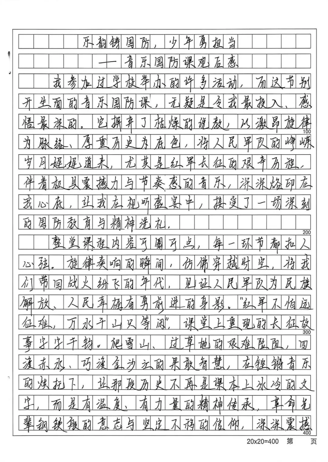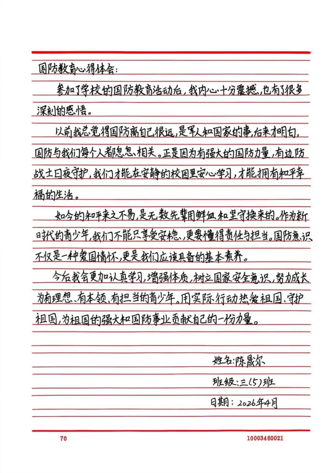 当一首首军歌在耳畔响起,当一幕幕英雄的画面在银幕上重现,许多队员的眼眶不知不觉湿润了。有的孩子紧紧攥着胸前的红领巾,有的悄悄抹去眼角的泪花,更有人跟着旋律轻声哼唱,声音里满是坚定与崇敬。这堂有温度、有力量的音乐国防课,让强军的火种在每一颗幼小的心房中熊熊燃烧。课后,孩子们久久不愿离去,他们拿起笔,把满腔的感动与决心写进一篇篇观后感里——那些稚嫩却滚烫的文字,是国防种子已然扎根的最好证明。