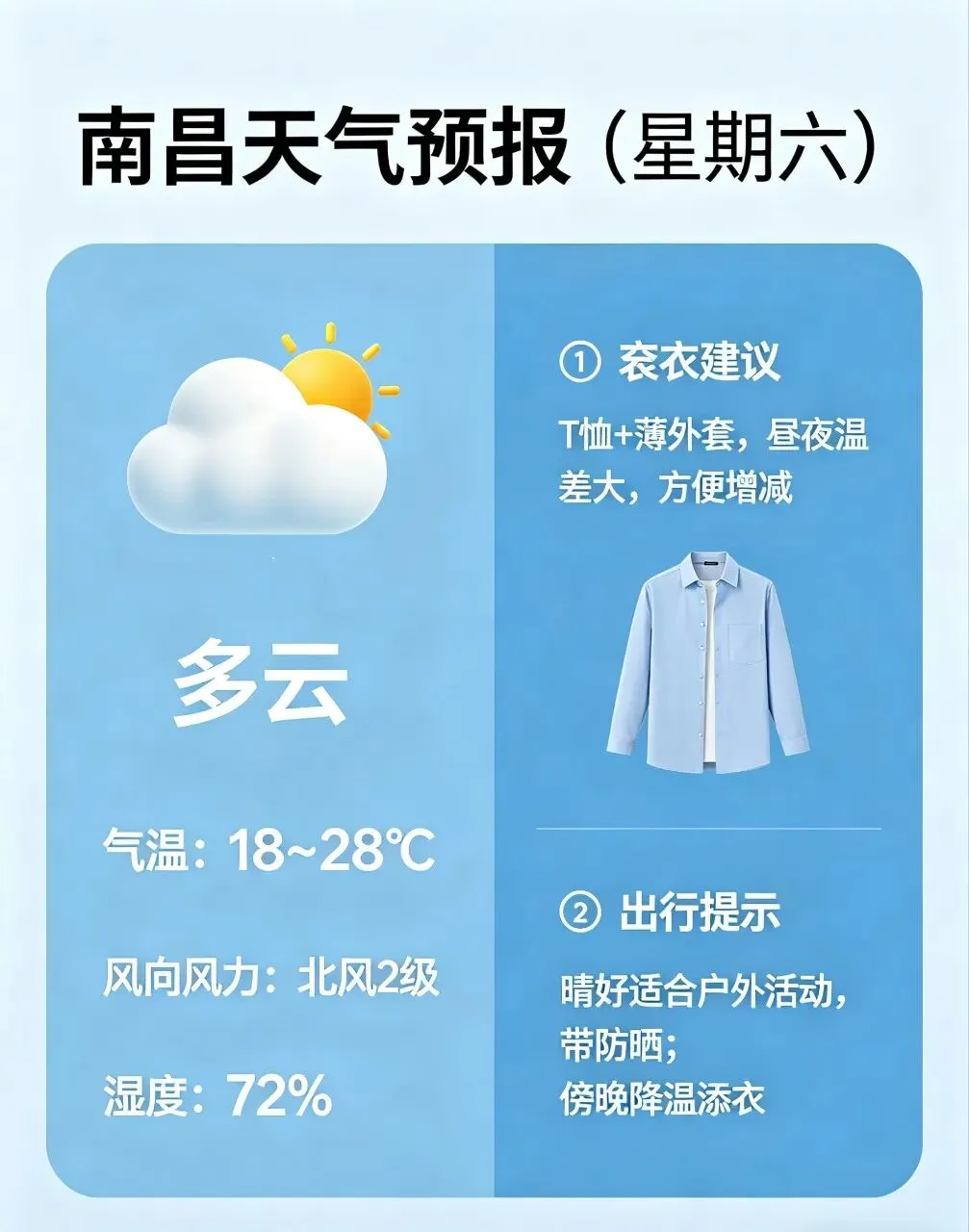 - 出行:晴好适合户外活动,带防晒;傍晚降温添衣