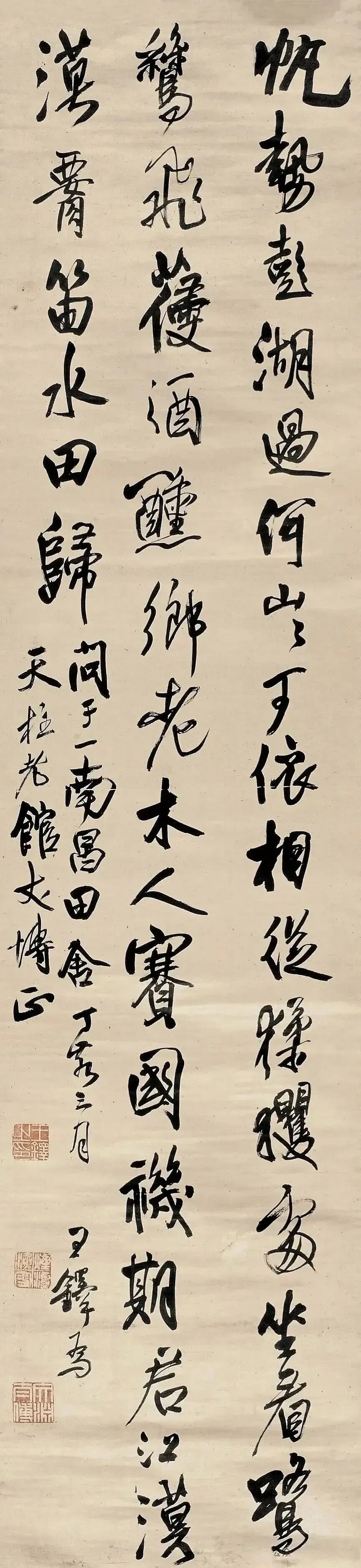 丁亥年(清顺治四年,公元1647年)三月,时年五十五岁的王铎,为天柱老馆丈书写了这幅行书立轴《问于一南昌田舍》。人至中年,历经朝代更迭与世事沧桑,其笔下的诗文却描绘了一幅生动的江村闲景。作品释文中,彭湖的帆影、可依的青山、猿猱鹭鸶的野趣,以及乡老赛神的质朴场面,共同勾勒出一个超然物外的理想栖所。末句“期君江漠漠,腰笛水田归”,更流露出深切的田园归隐之思。