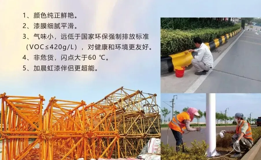 在性能上,晨虹刷新漆颜色纯正鲜艳,刷出的脚手架警示效果醒目,有效提升工地安全辨识度;漆膜细腻平滑、附着力强,能抵御工地风吹日晒、磕碰磨损,不易起皮褪色,大幅延长设施使用寿命,减少反复刷新的成本与工期损耗。